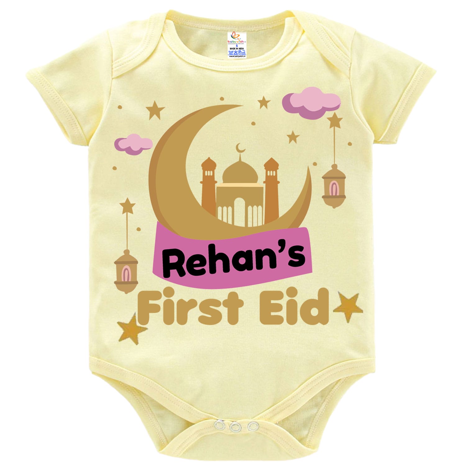 Make your baby’s first Eid celebration extra special with our Personalized First Eid Baby T-Shirt by Babywish. Designed with a stunning crescent moon, mosque silhouette, stars, and lantern artwork, this adorable Eid outfit adds a magical festive charm to your little one’s celebration.