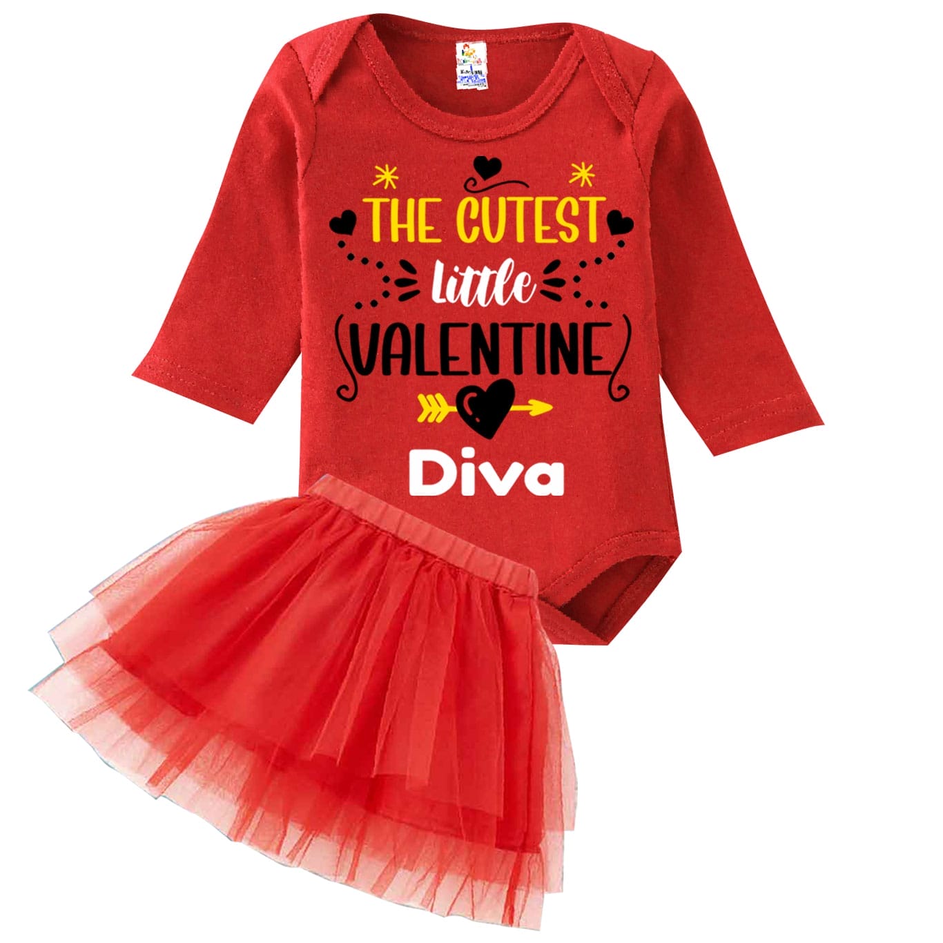 baby Cutest Little Valentine Personalized Baby Romper with Tutu Skirt | Custom Name Full Sleeve Soft Cotton Valentine Outfit for Babies | Age 0-12 Months | Red, Red-White, Black or Black-White | Babywish