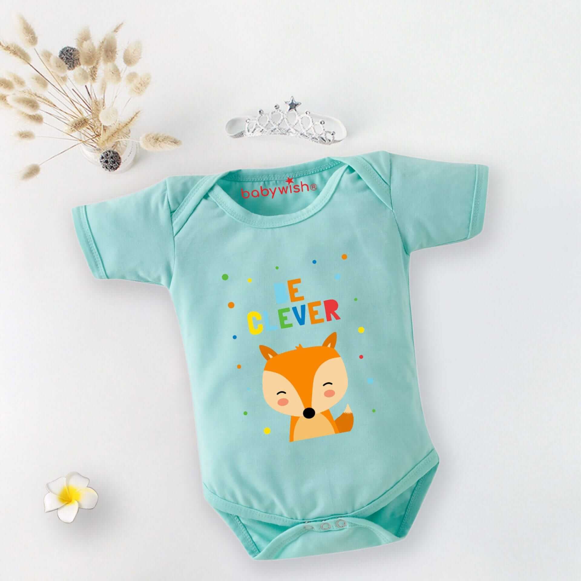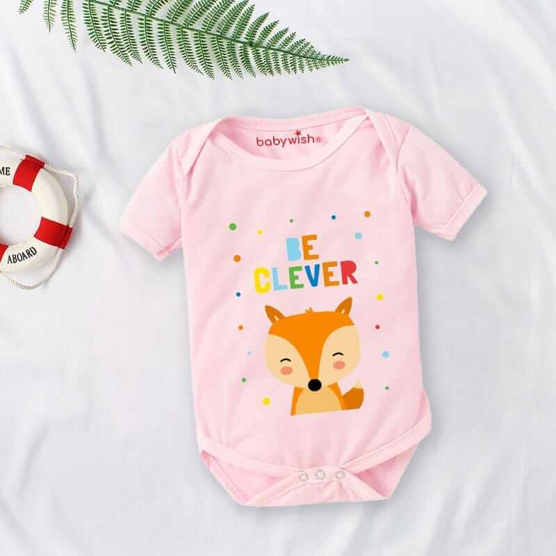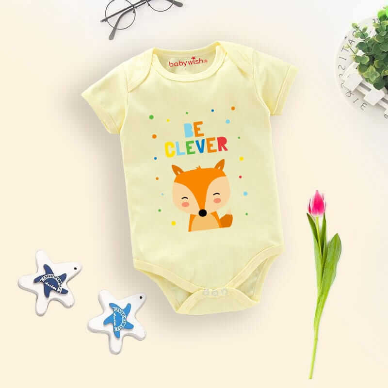 Be the first to review “Baby First Birthday Celebrations Romper Clothes for Newborns – Cute Bodysuit Outfit, Half Sleeve Unisex Onesies, Envelop Neck Design “Be Clever Deer Print””