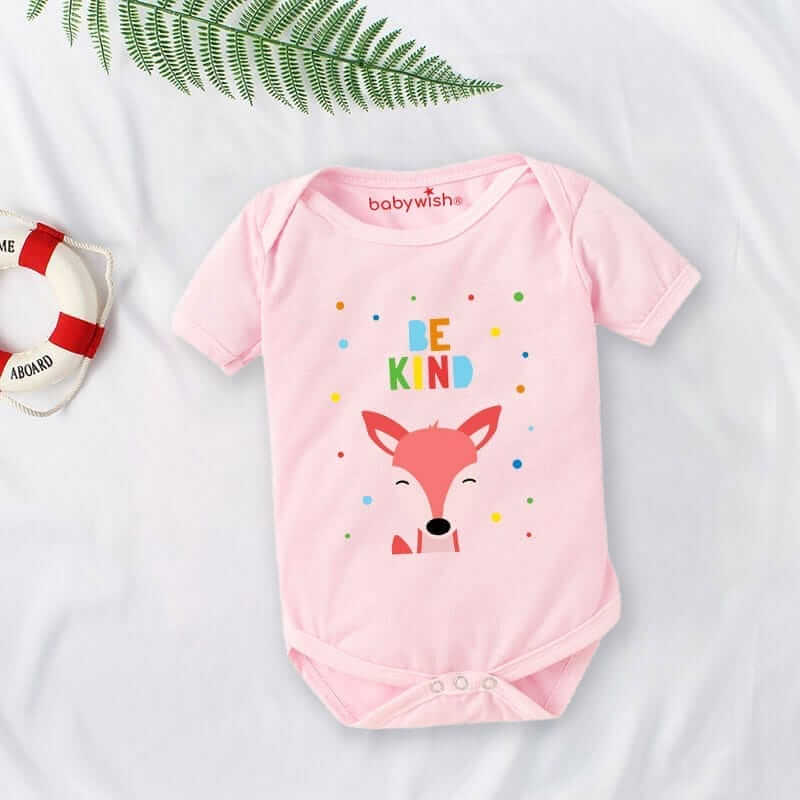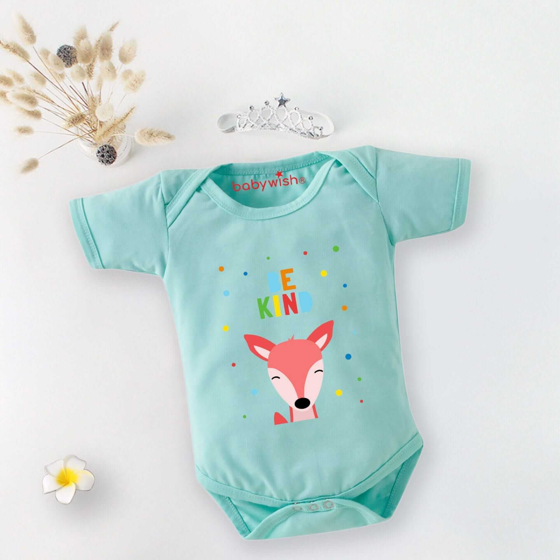 Be the first to review “Baby First Birthday Celebrations Romper Clothes for Newborns – Cute Bodysuit Outfit, Half Sleeve Unisex Onesies, Envelop Neck Design “Be Kind Deer Print””