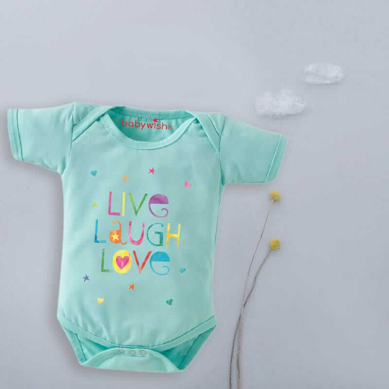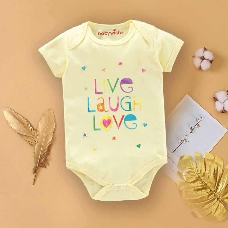 Baby First Birthday Romper Outfit for Newborns – Half Sleeve Bodysuits, Unisex Onesies with Envelop Neck, Adorable “Live Laugh Love Print” Design