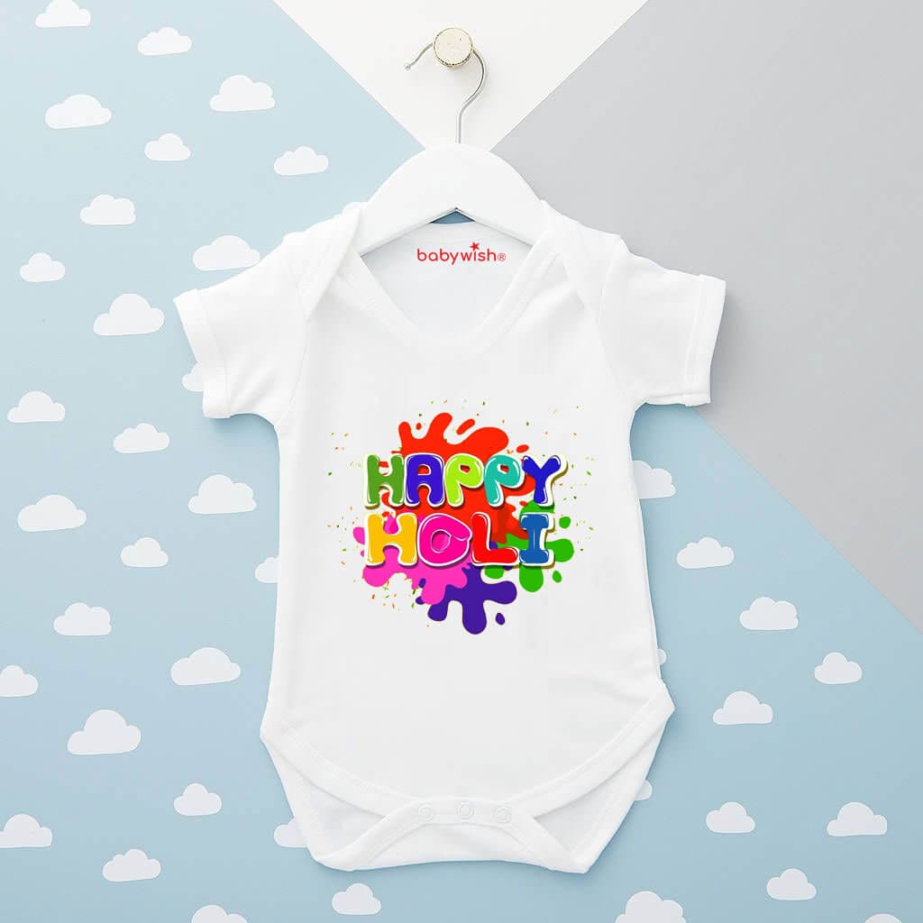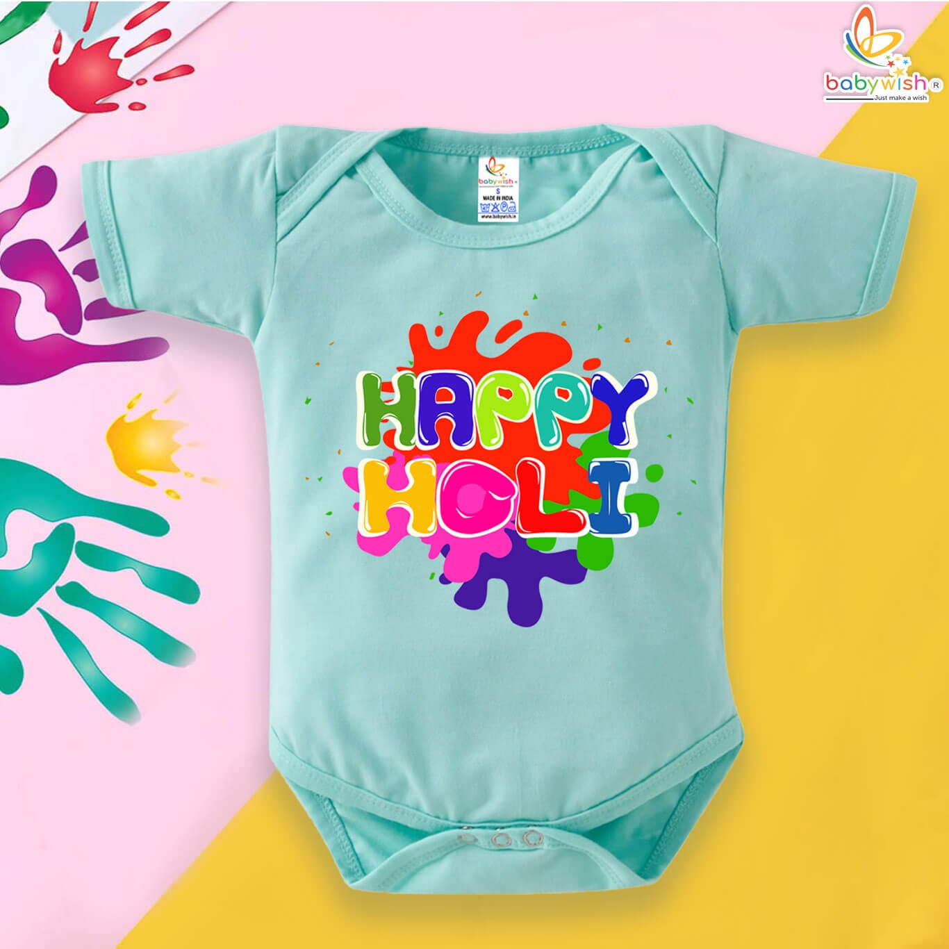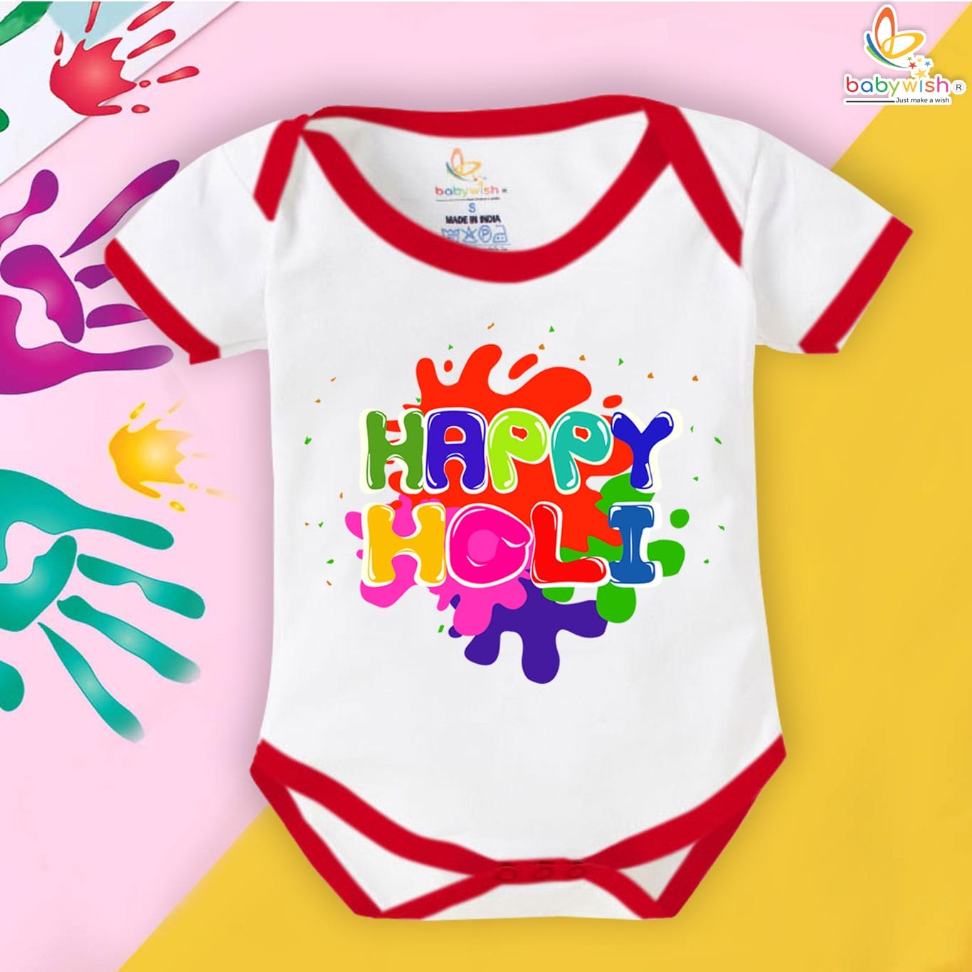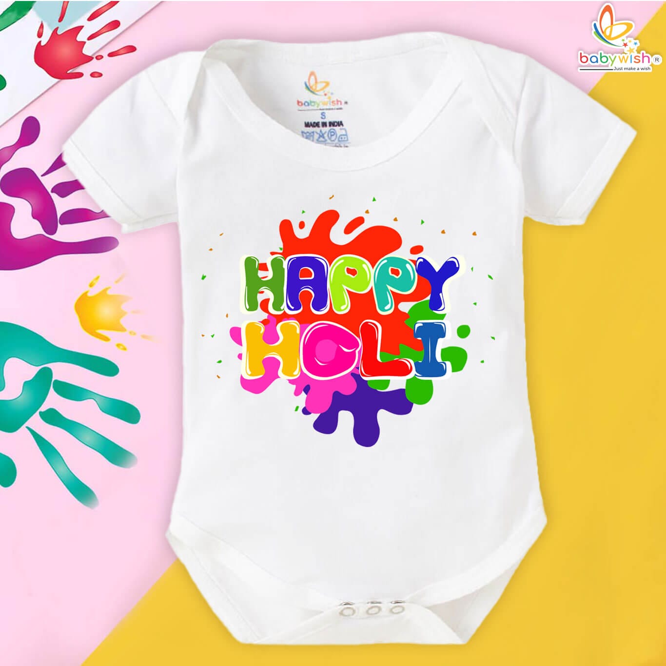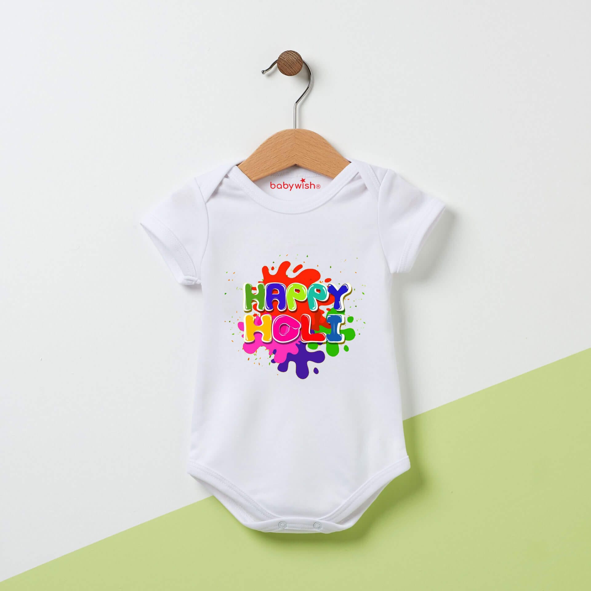 Dress your little one in festive joy with the Happy Holi Baby Romper by Babywish. Made from soft cotton, this colorful baby Holi wear keeps newborns comfy, cute, and celebration-ready.