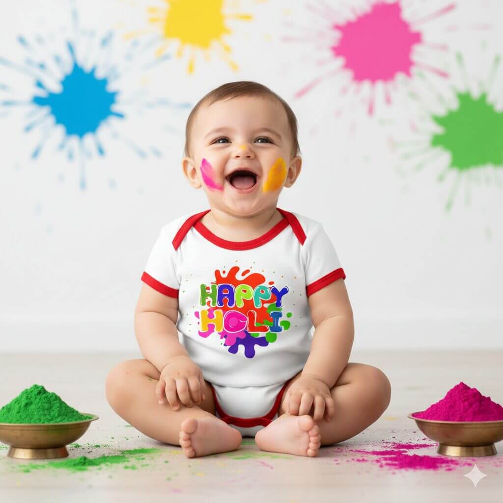 Celebrate your baby’s Holi in the most adorable way with the Happy Holi Baby Romper / Onesie by Babywish. Designed especially for newborns and infants, this romper features a bright and playful Holi splash print that perfectly captures the joy and colors of the festival.