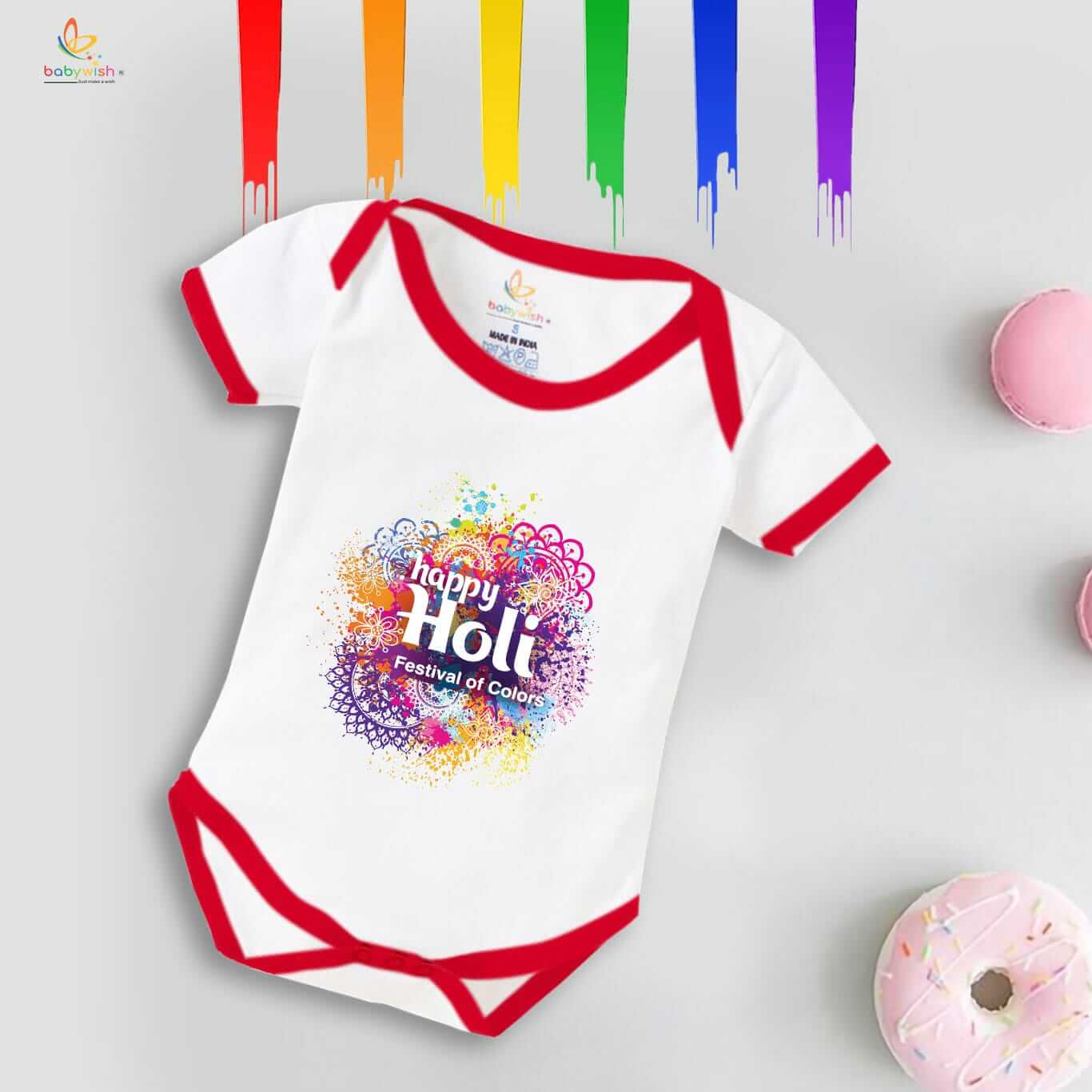 Baby First Holi Romper Clothes | Baby Holi Festival Bodysuits | Newborn Outfit Envelop Neck Half Sleeve Unisex Onesies “Festival Of Color”