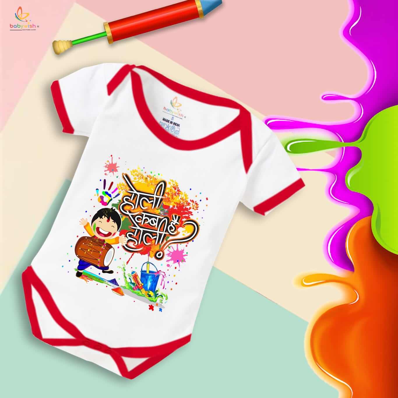 Baby First Holi Romper Clothes | Baby Holi Festival Bodysuits | Newborn Outfit Envelop Neck Half Sleeve Unisex Onesies “Holi Kab Hai Batao”