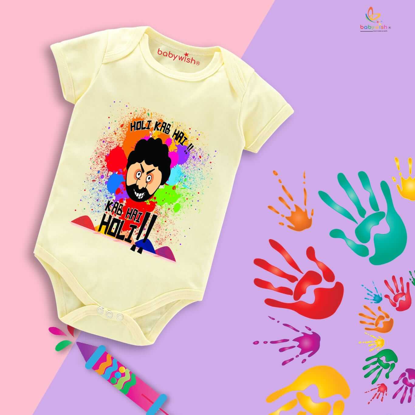 Baby First Holi Romper Clothes | Baby Holi Festival Bodysuits | Newborn Outfit Envelop Neck Half Sleeve Unisex Onesies “Holi Kab Hai Kab Hai Holi”