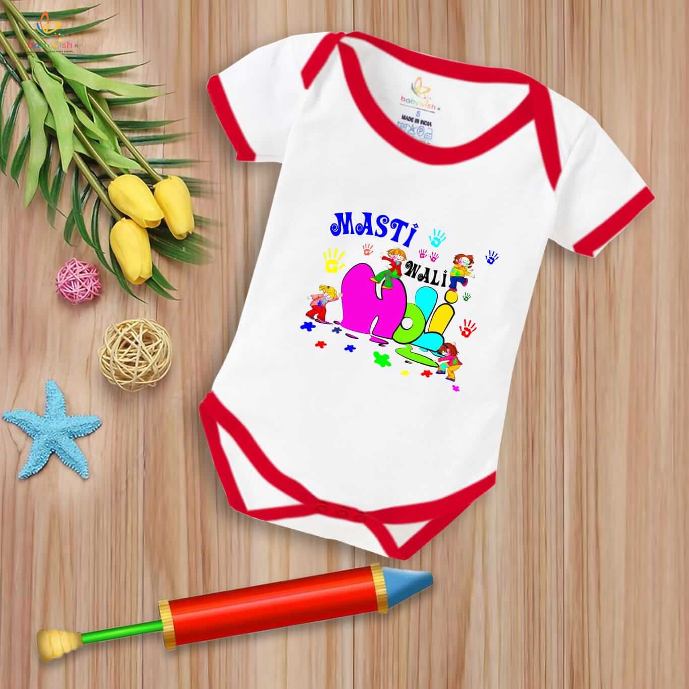 Baby First Holi Romper Clothes | Baby Holi Festival Bodysuits | Newborn Outfit Envelop Neck Half Sleeve Unisex Onesies “Masti Wali Holi”