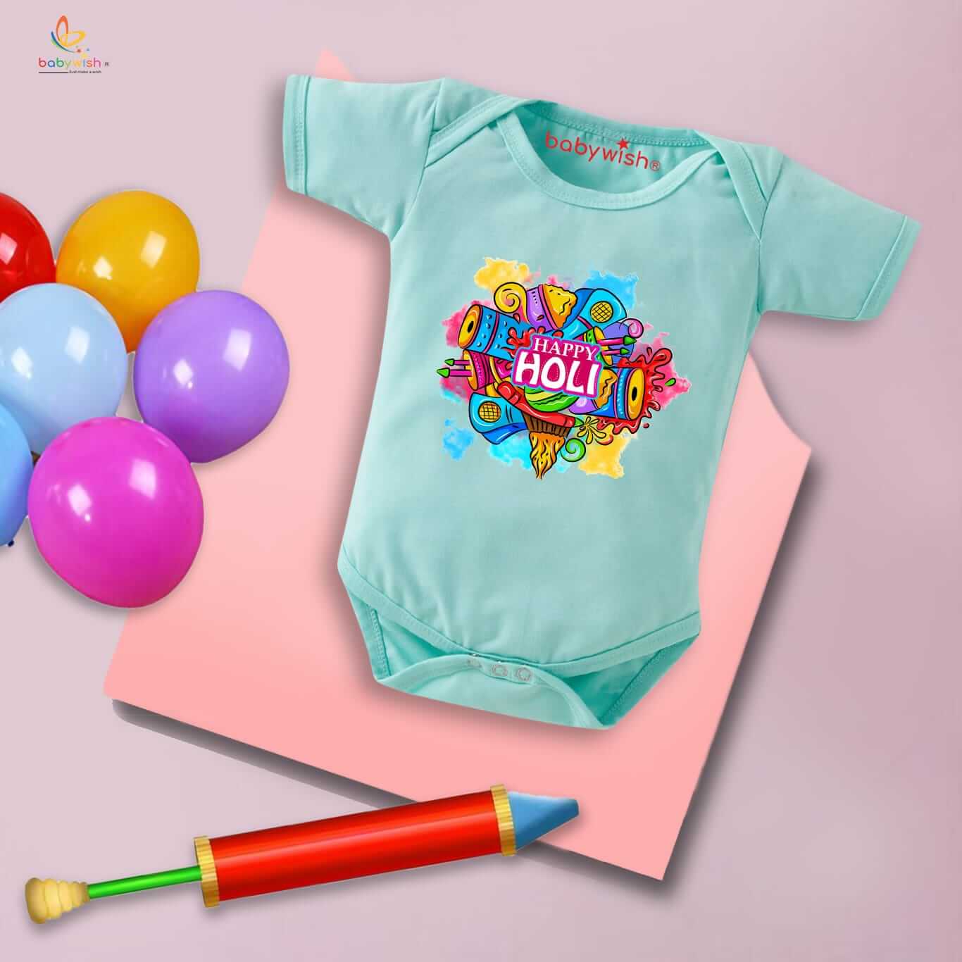 Baby First Holi Romper Clothes | Baby Holi Festival Bodysuits | Newborn Outfit Envelop Neck Half Sleeve Unisex Onesies “Music in Holi”
