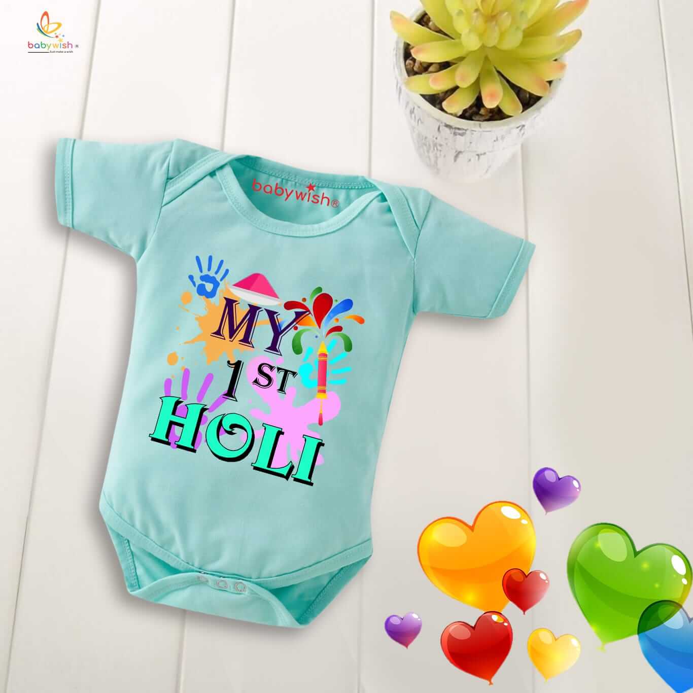 Baby First Holi Romper Clothes | Baby Holi Festival Bodysuits | Newborn Outfit Envelop Neck Half Sleeve Unisex Onesies “My 1st Holi Print Color”