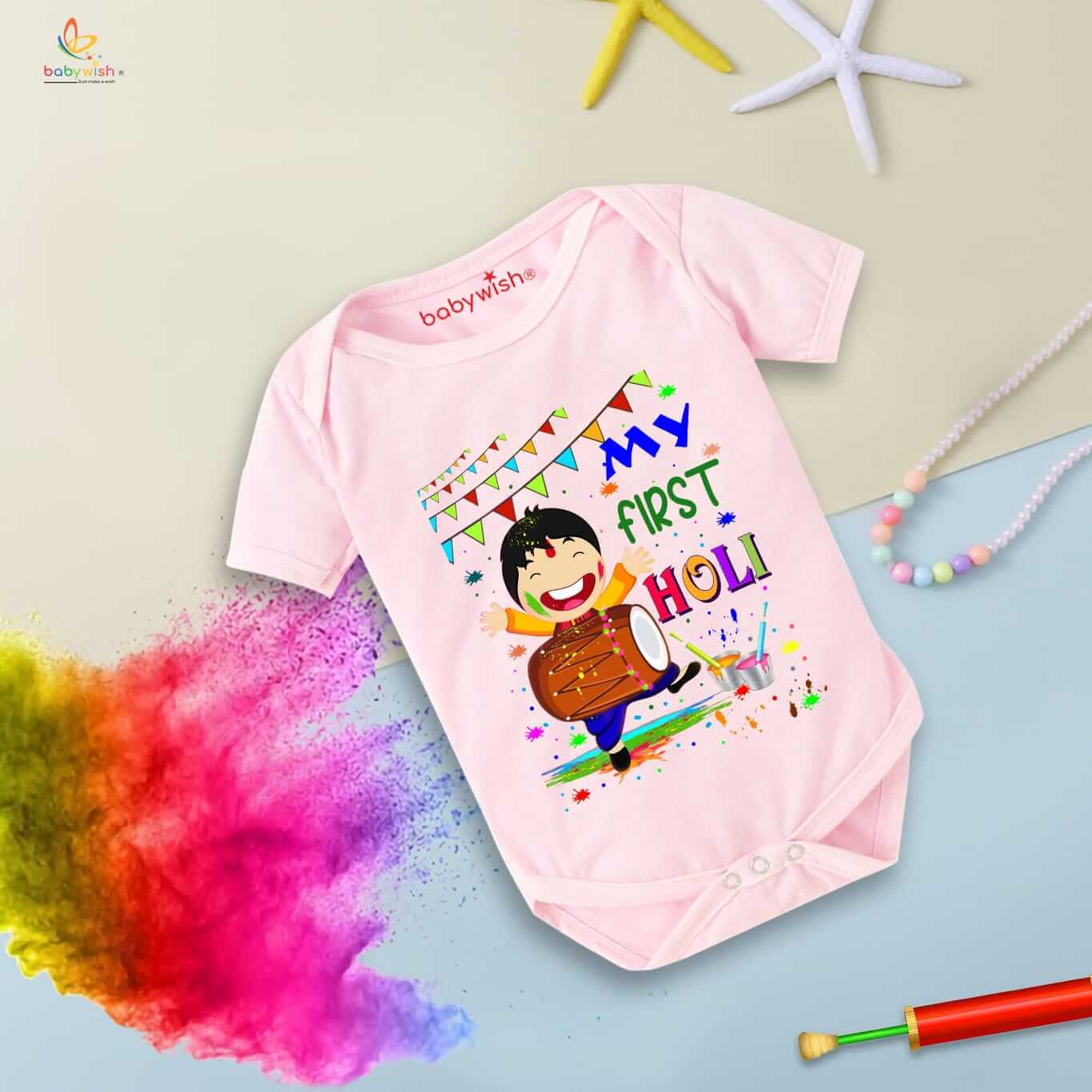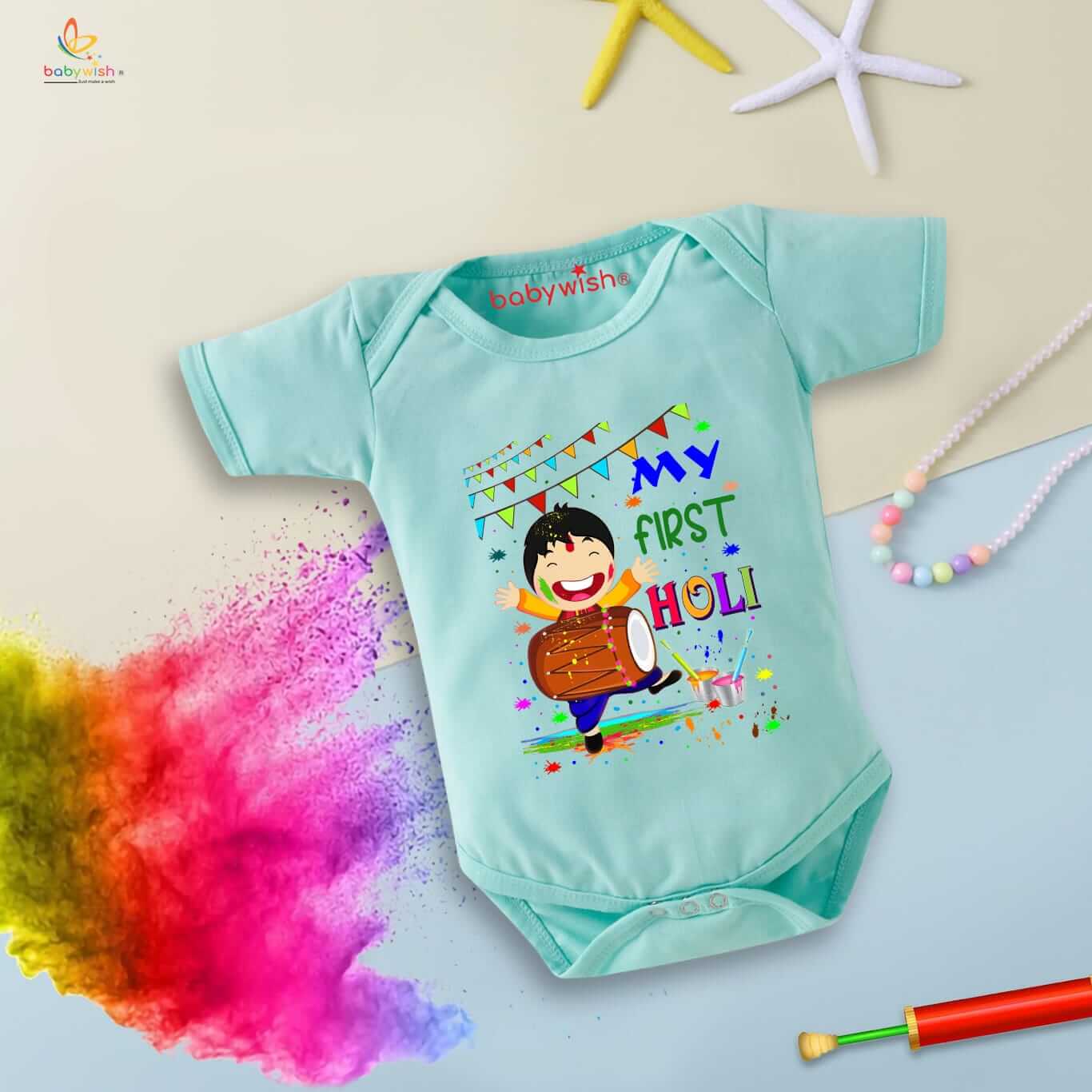 Baby First Holi Romper Clothes | Baby Holi Festival Bodysuits | Newborn Outfit Envelop Neck Half Sleeve Unisex Onesies “My First Holi with Music”