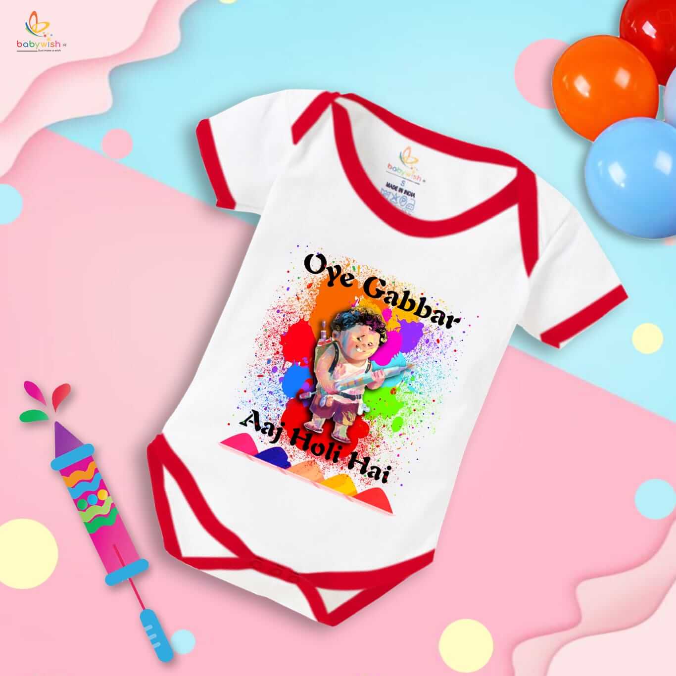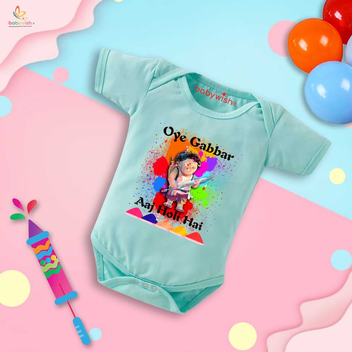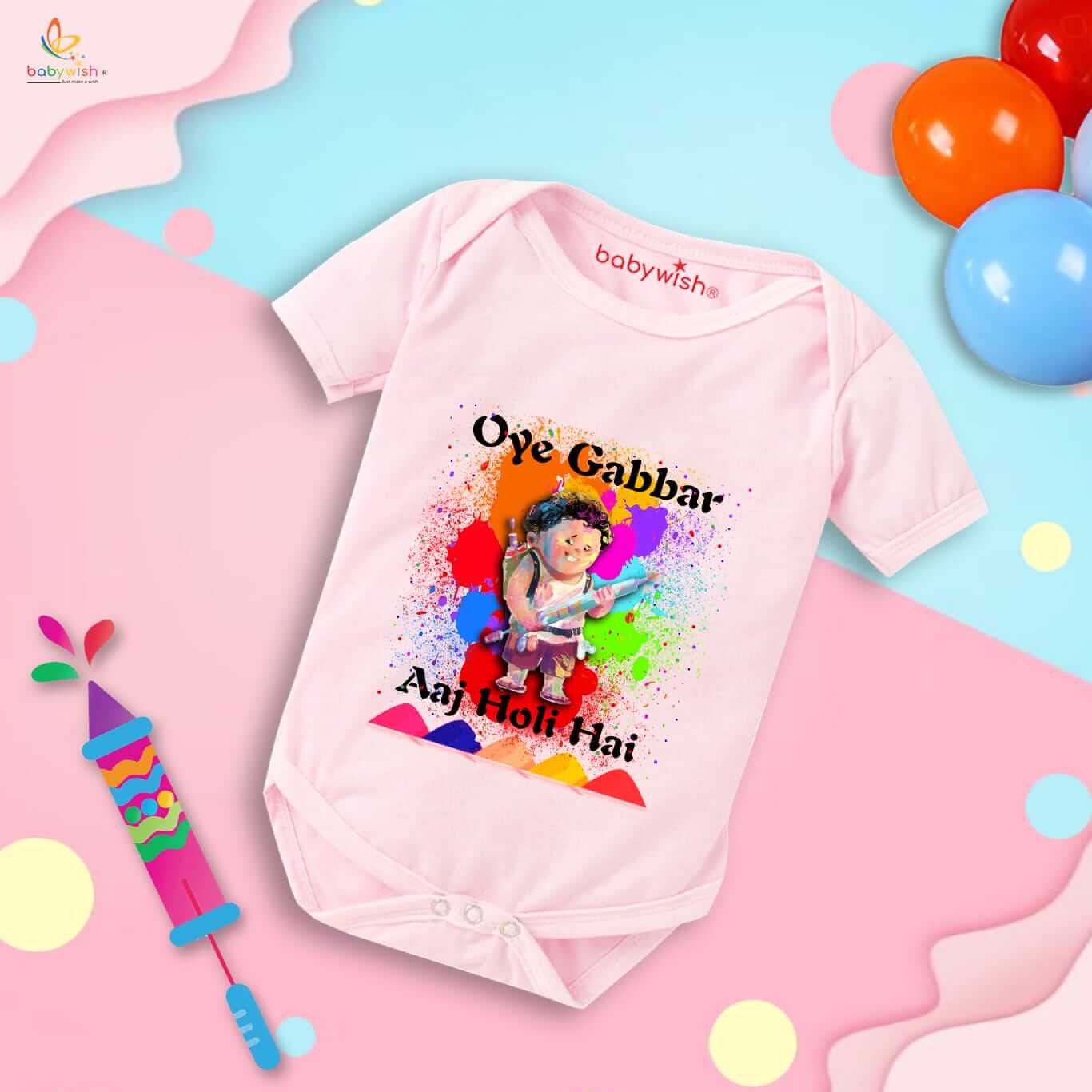 Baby First Holi Romper Clothes | Baby Holi Festival Bodysuits | Newborn Outfit Envelop Neck Half Sleeve Unisex Onesies “Oye Gabbar Aaj Holi Hai”