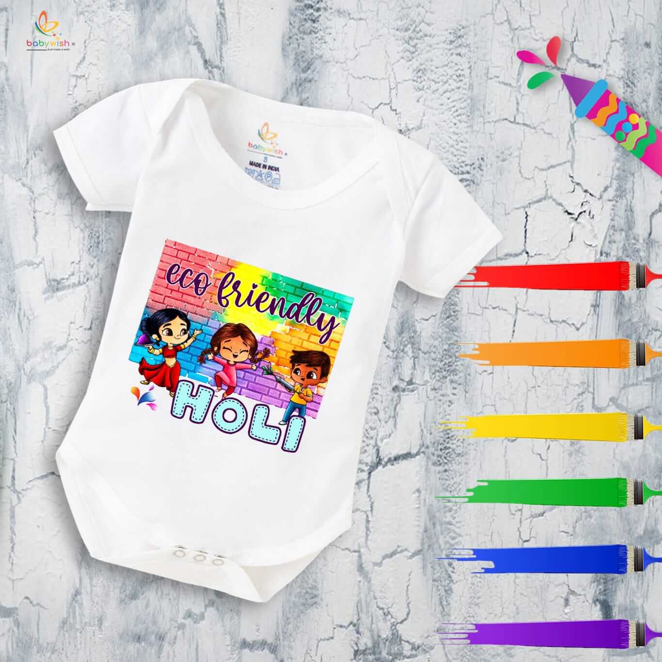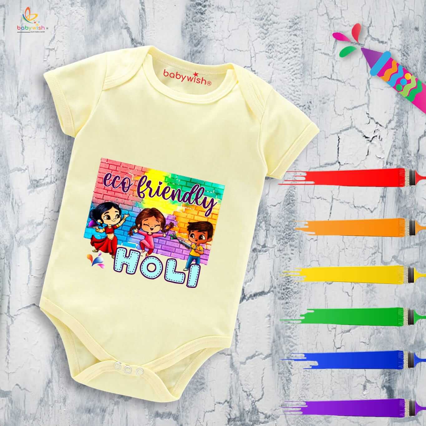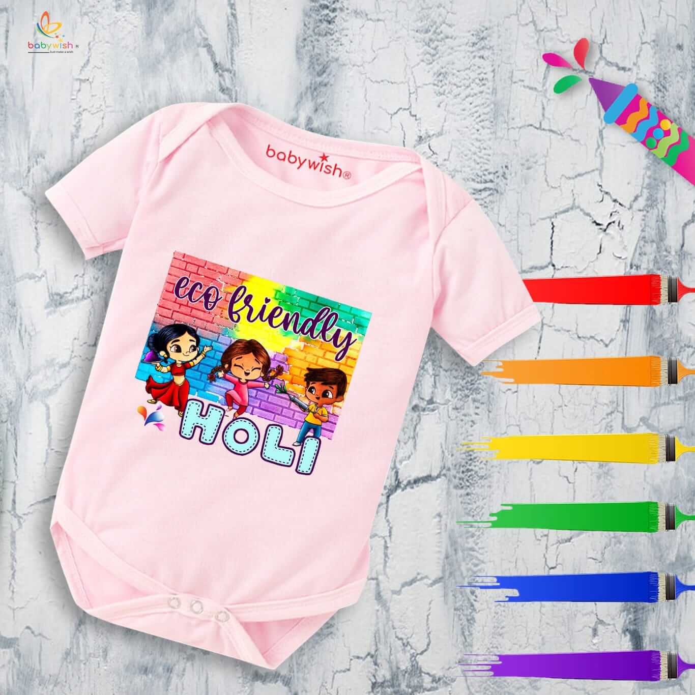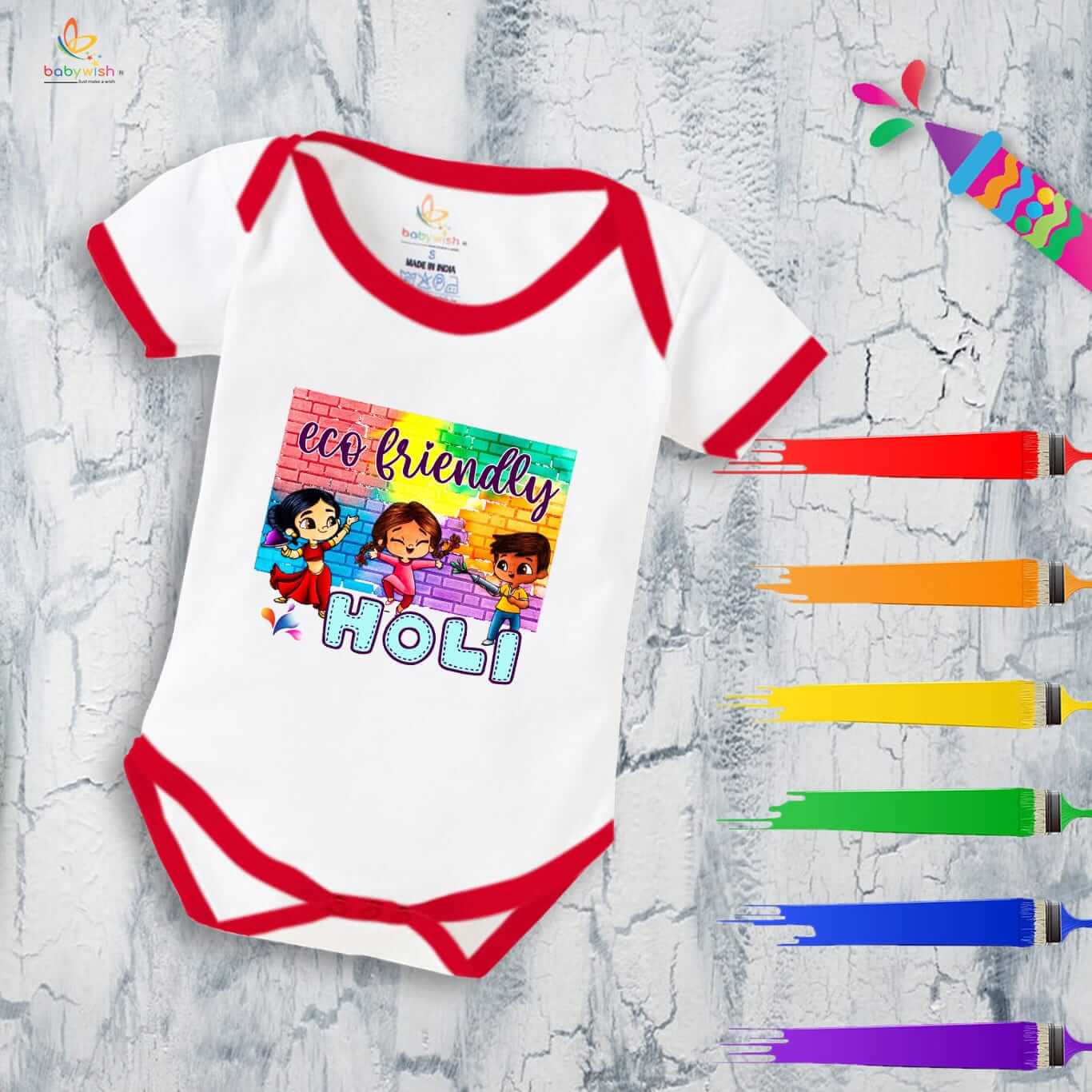 Baby First Holi Romper Clothes | Baby Holi Festival Bodysuits | Newborn Outfit Envelop Neck Half Sleeve Unisex Onesies “Play Ecofriendly Holi”