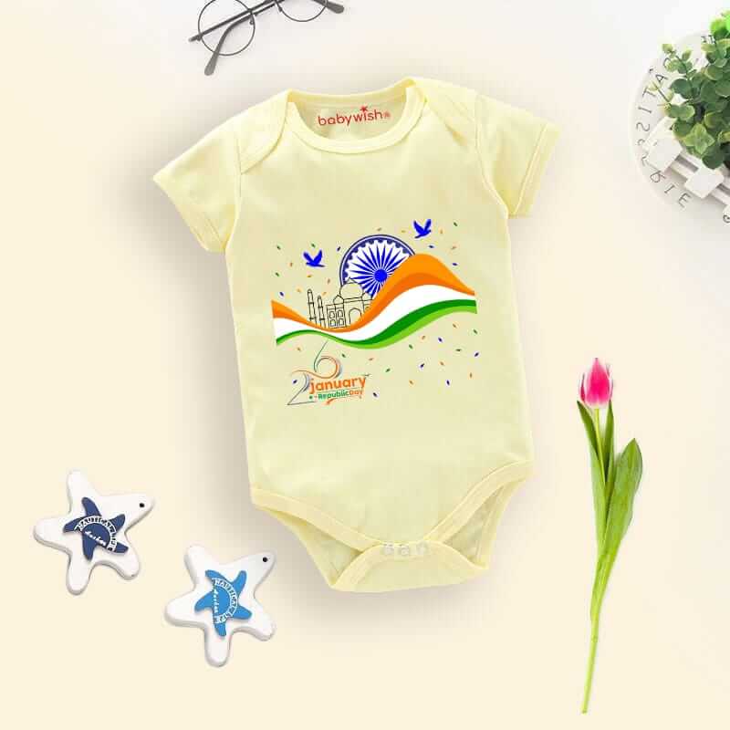 Baby First Republic Day Romper Clothes Baby Bodysuits Newborn Outfit Envelop Neck Half Sleeve Unisex Onesies”Happy Republic Day”