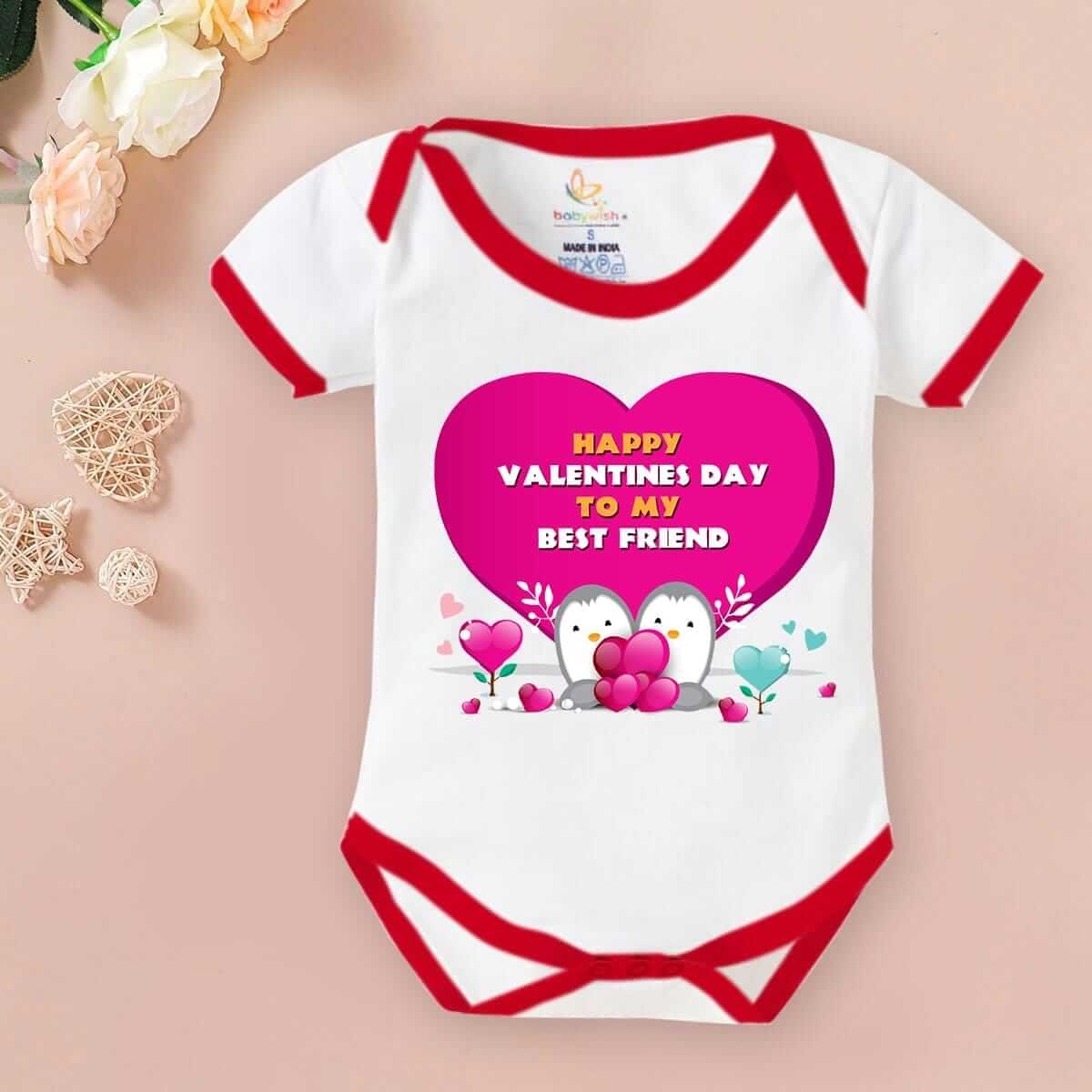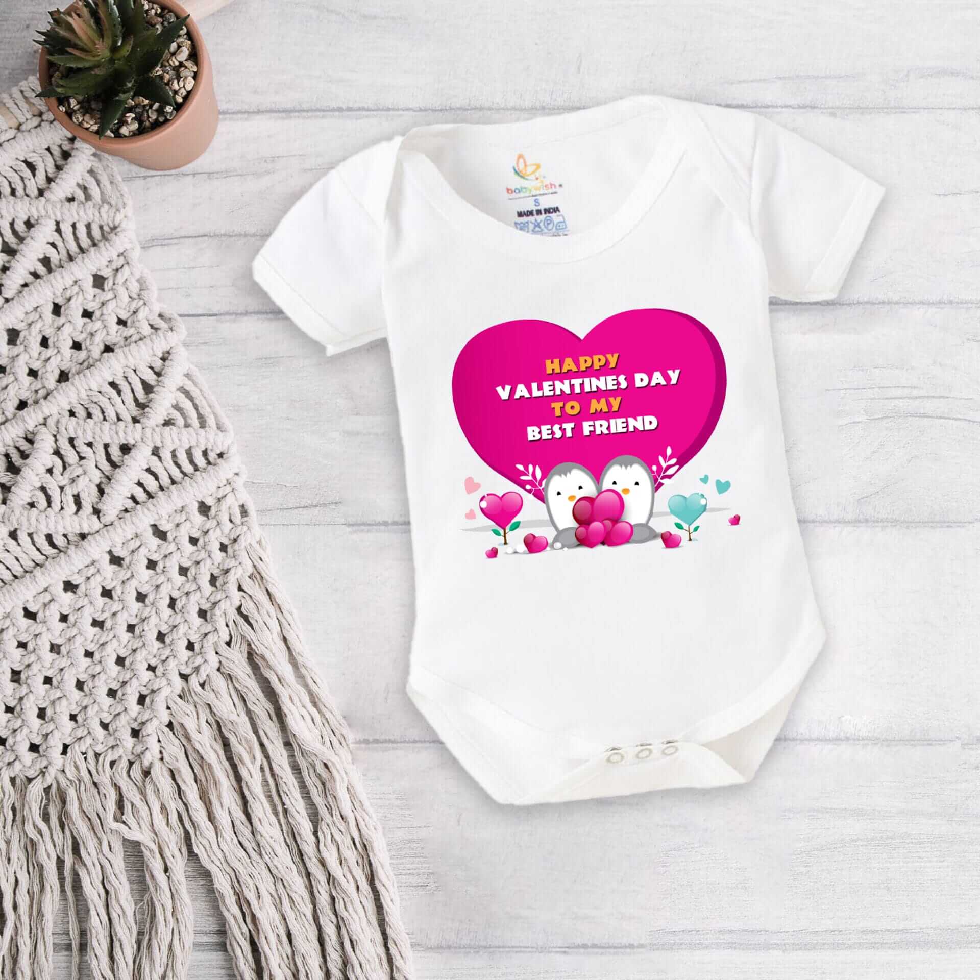 Baby First Valentine’s Day Romper Clothes | Baby Valentine Bodysuits | Newborn Outfit Envelope Neck Half Sleeve Unisex Onesies “Happy Valentine Friend” | Cute Baby Gift for Boys & Girls