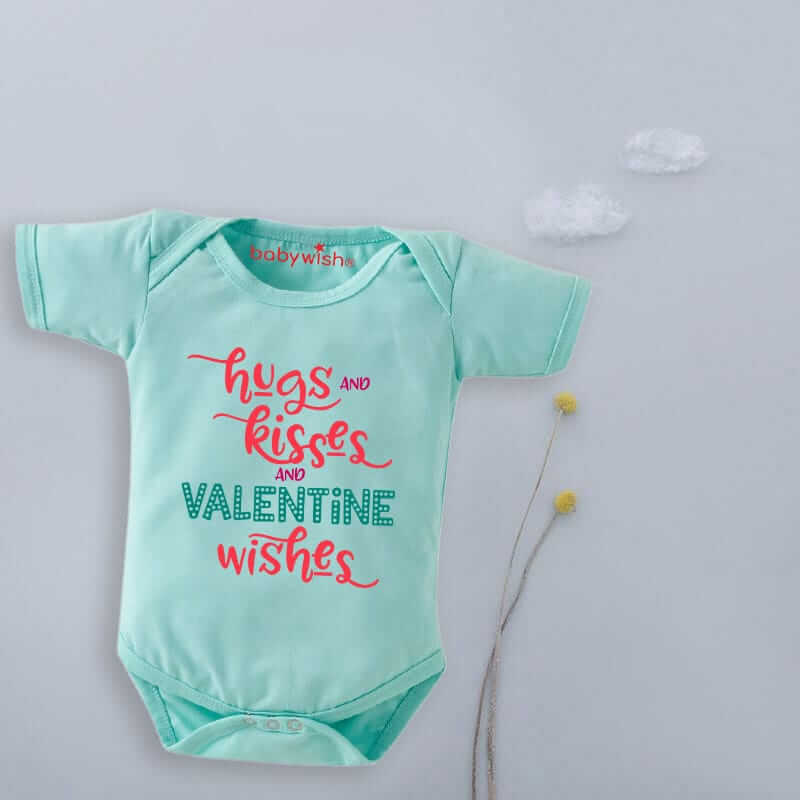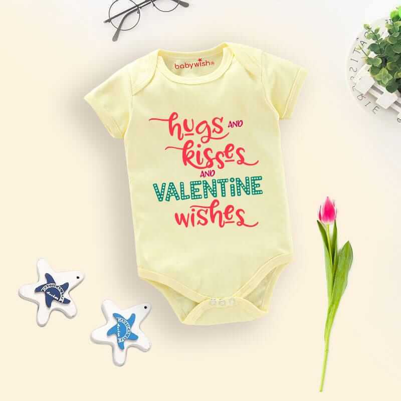 Baby First Valentine Day Romper Clothes | Baby Valentine Bodysuits Newborn Outfit | Envelop Neck Half Sleeve Unisex Onesies “Hugs And Kisses Valentine Wishes” Babywear | Babywish