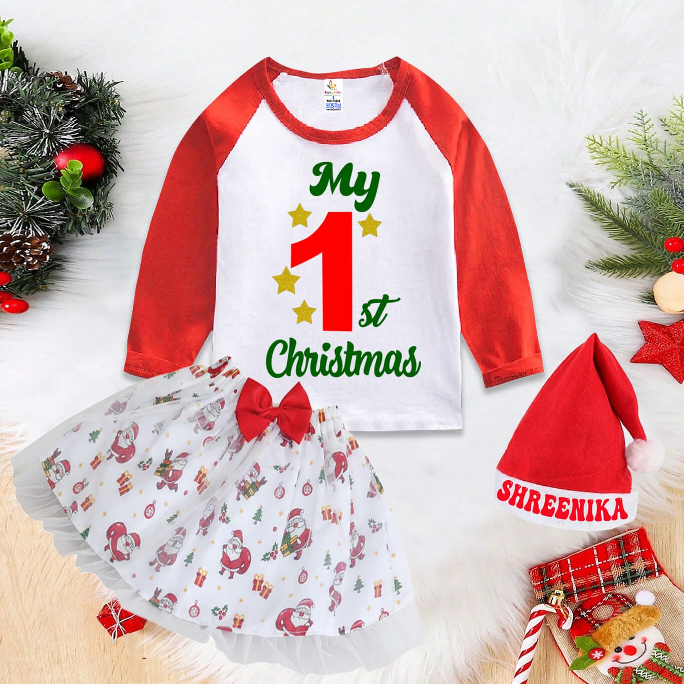 Make your baby girl’s first Christmas extra magical with this Personalized My 1st Christmas Outfit Set, perfectly designed for aged 1–3 Years. This adorable festive ensemble includes a soft red-and-white long-sleeve T-shirt featuring a vibrant “My 1st Christmas” print, a fluffy Santa-print tutu skirt with a cute red bow, and a customizable Santa hat with your baby’s name for an extra-special touch.
