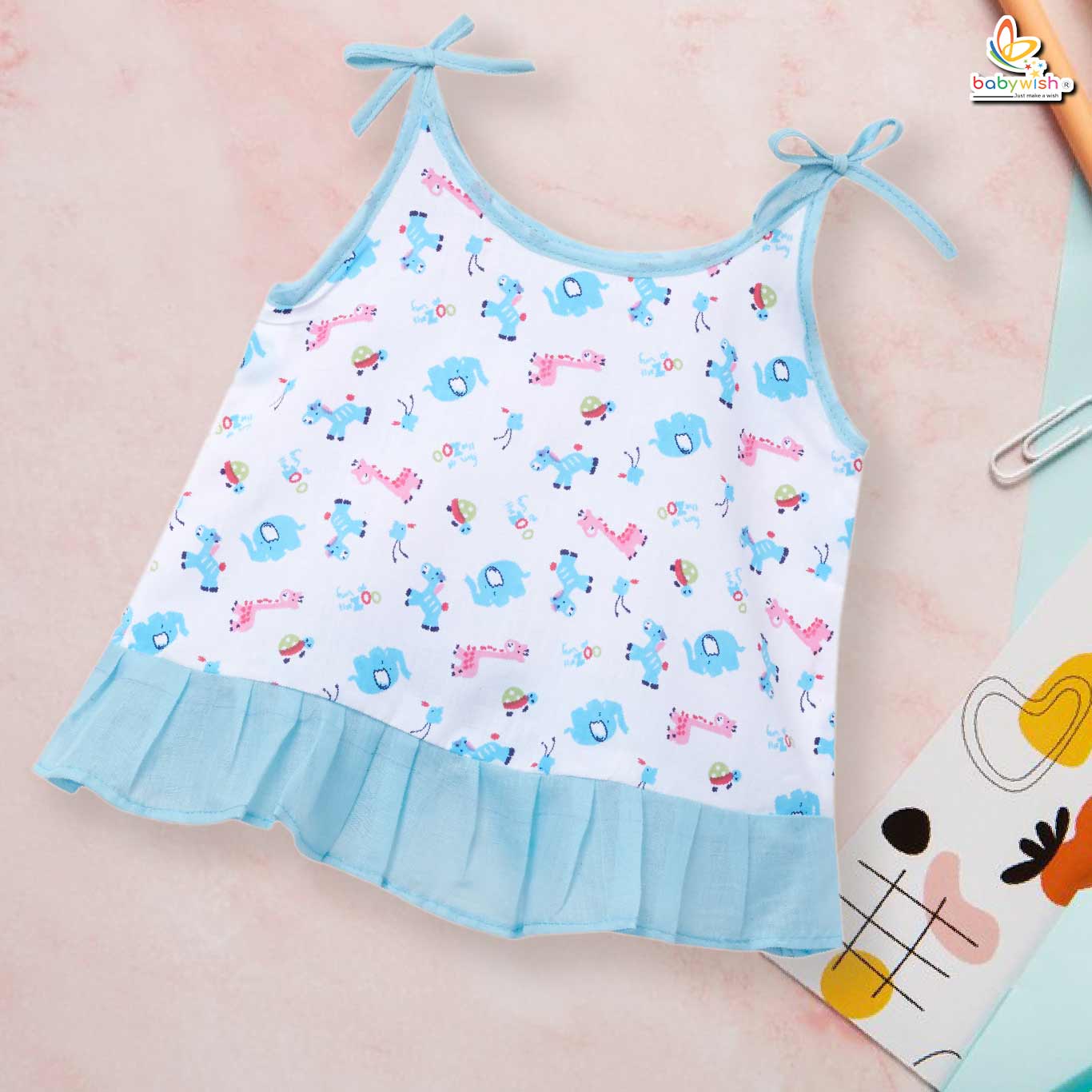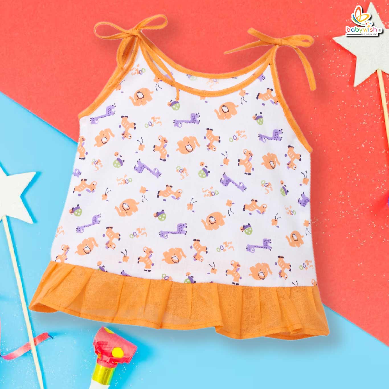 Keep your baby girl cool and comfy with this adorable sleeveless frock top by Babywish. Made from soft, breathable cotton, it features cheerful animal prints, tie-up shoulder straps, and a frilled hemline. Perfect for summer outings, playtime, or casual wear. A must-have addition to her cute wardrobe.