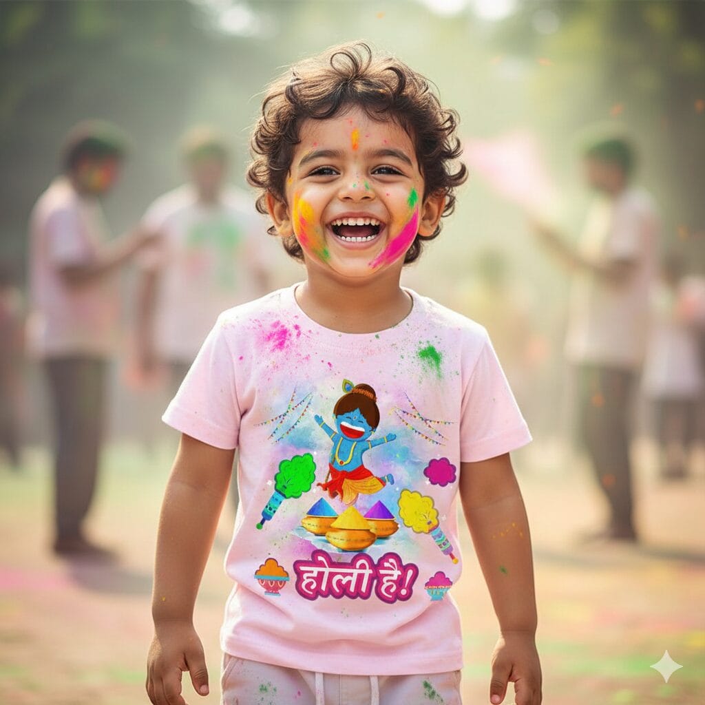 Celebrate the joy and colors of Holi with this adorable “Holi Hai” Kids T-Shirt by Babywish, designed to bring festive cheer and all-day comfort to your little ones. Featuring a playful Krishna Holi illustration, vibrant gulal pots, and fun pichkari graphics, this T-shirt beautifully captures the true spirit of India’s favorite festival.