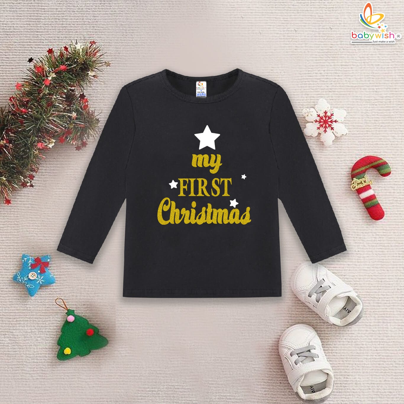 Make your child’s holiday season extra special with the Babywish My First Christmas Glitter Print Full Sleeve T-Shirt, designed to deliver festive charm, comfort, and premium quality. This adorable Christmas top features a gold glitter thermal print, giving a sparkling finish that stays bright and intact even after multiple washes. The thermal glitter printing ensures long-lasting shine, superior adhesion, and a soft-touch feel, making it both durable and comfortable.