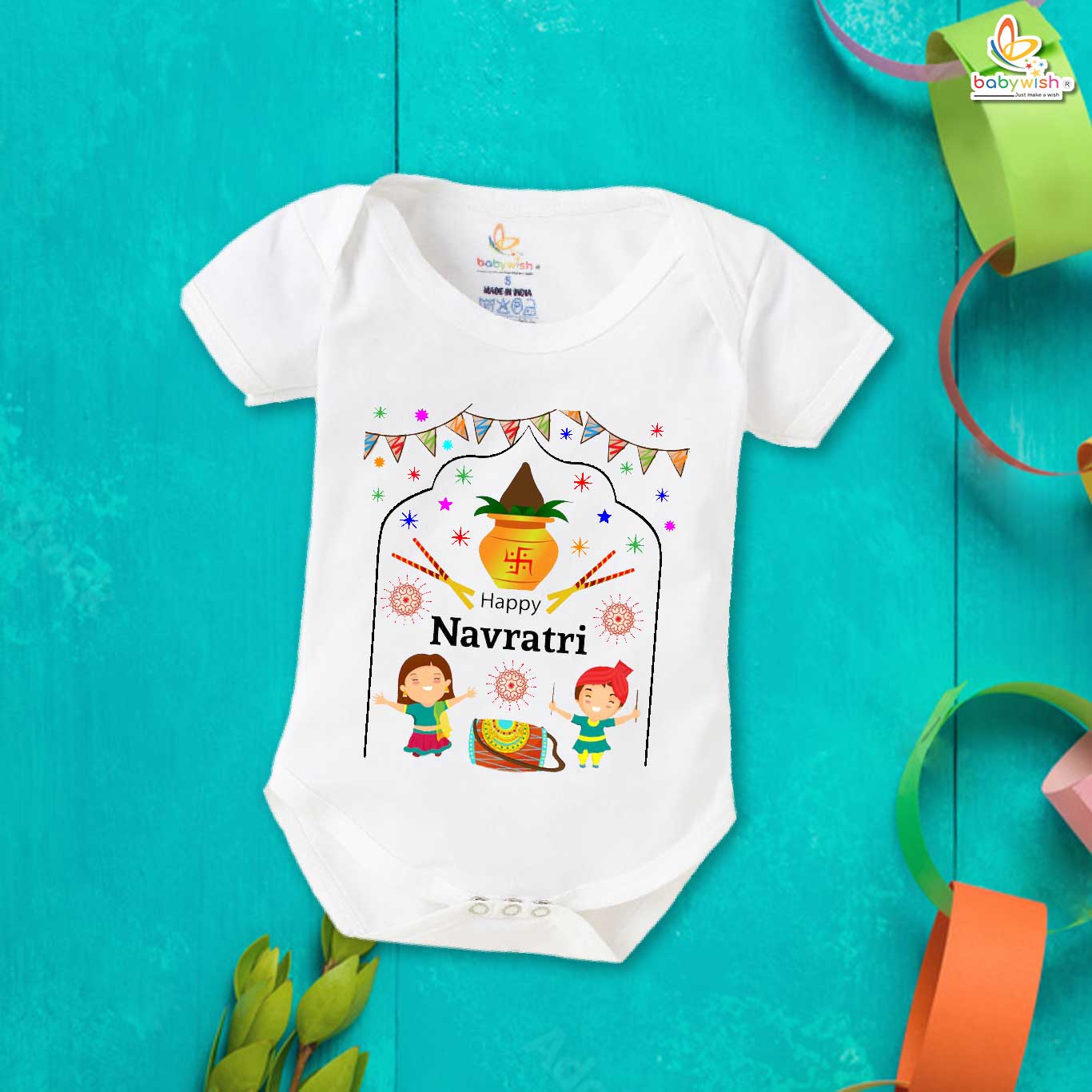 Baby Navratri Romper Bodysuit for Boys and Girls, My First Dussehra Outfit, Happy Navratri Temple Printed Onesie, Comfortable Cotton Romper for Festive Celebration Babywish