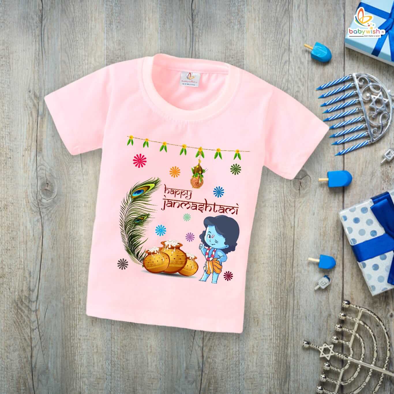 Dahi Handi T-Shirt for Boys and Girls, Krishna Janmashtami Celebration Tee, Soft Cotton Half Sleeve Topwear, Happy Krishna Janmashtami Outfit Babywish