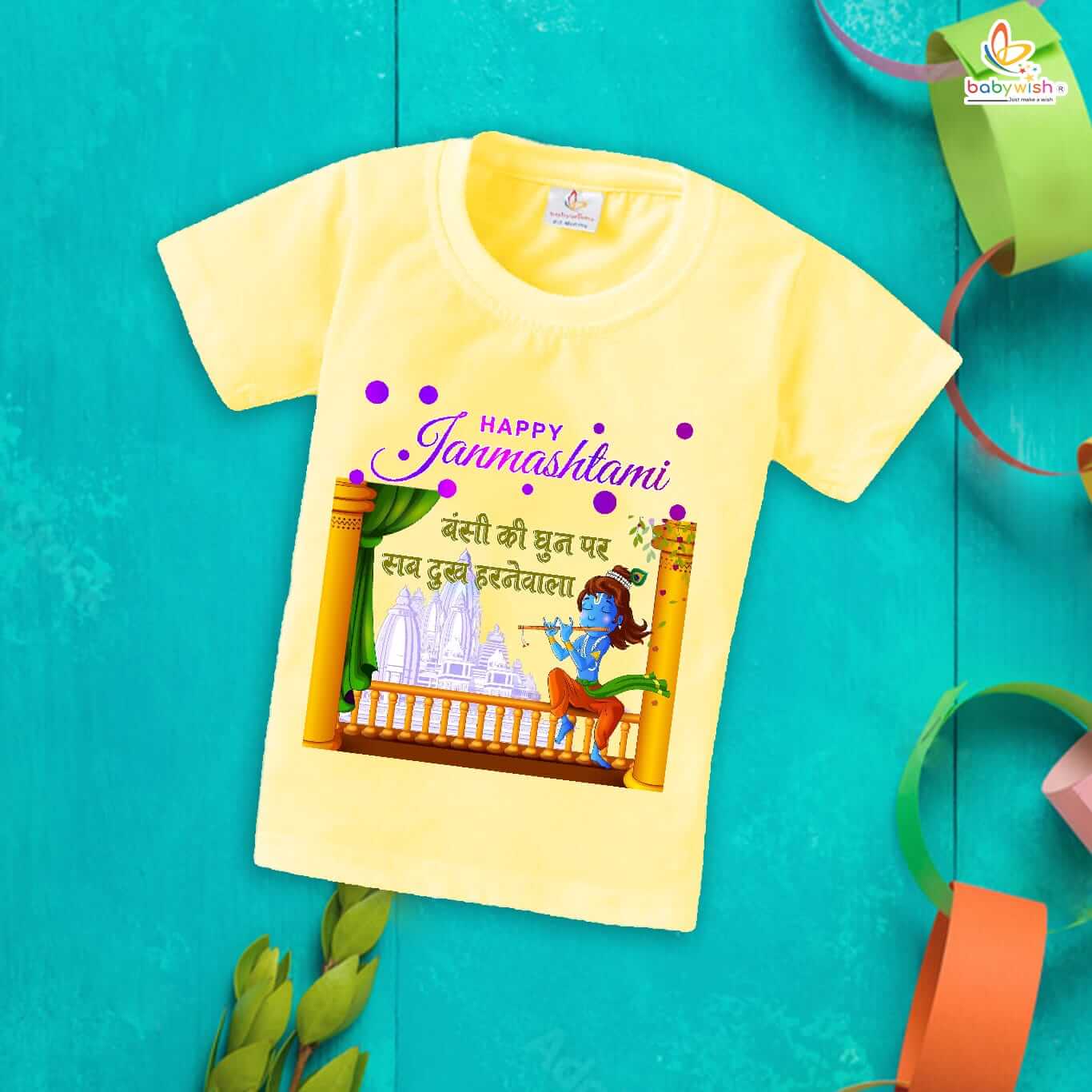 Dahi Handi T-Shirt for Boys and Girls, Krishna Janmashtami Celebration Tee, Soft Cotton Half Sleeve Topwear, Happy Krishna Janmashtami Outfit Babywish