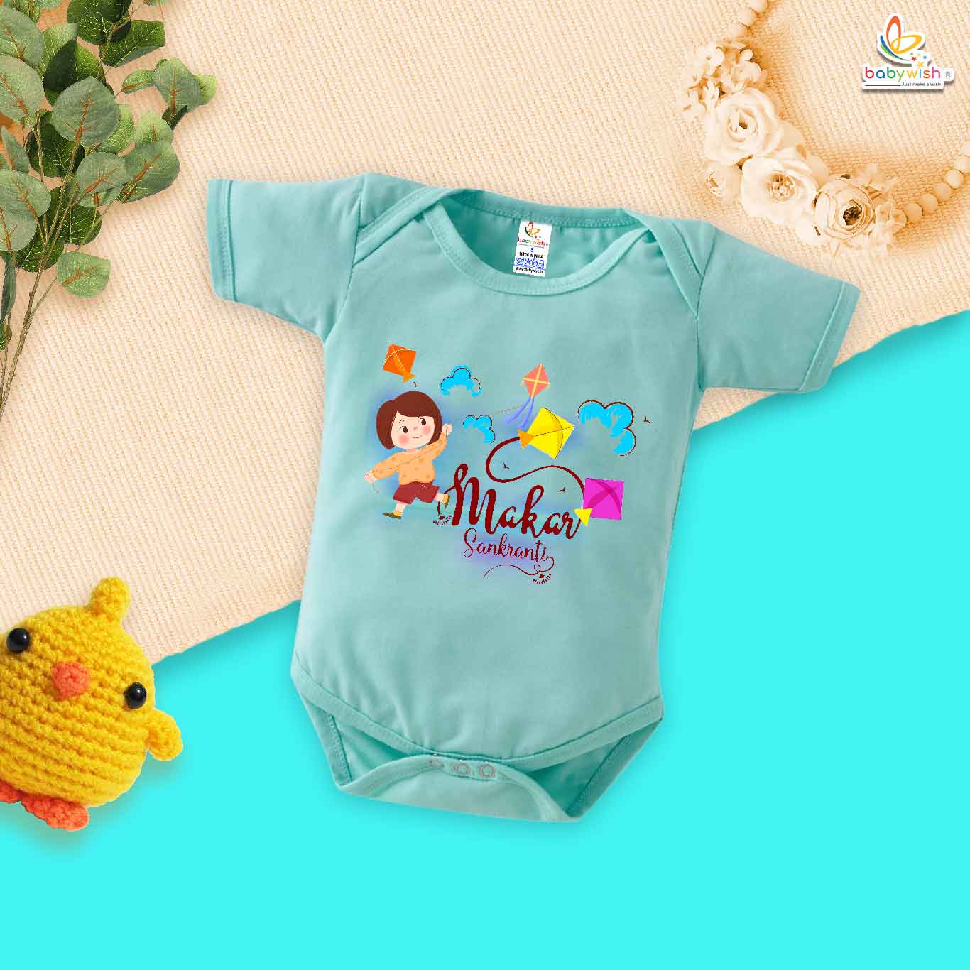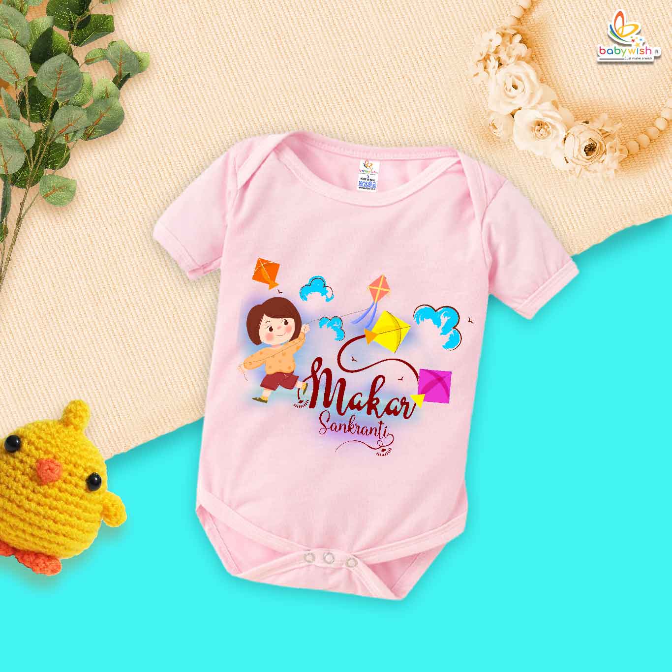 My First Makar Sankranti Baby Romper | Girl Kite Print Bodysuit for Newborns & Infants | Festive Sankranti Outfit for Baby Girls | Cute Traditional Baby Clothes | Babywish