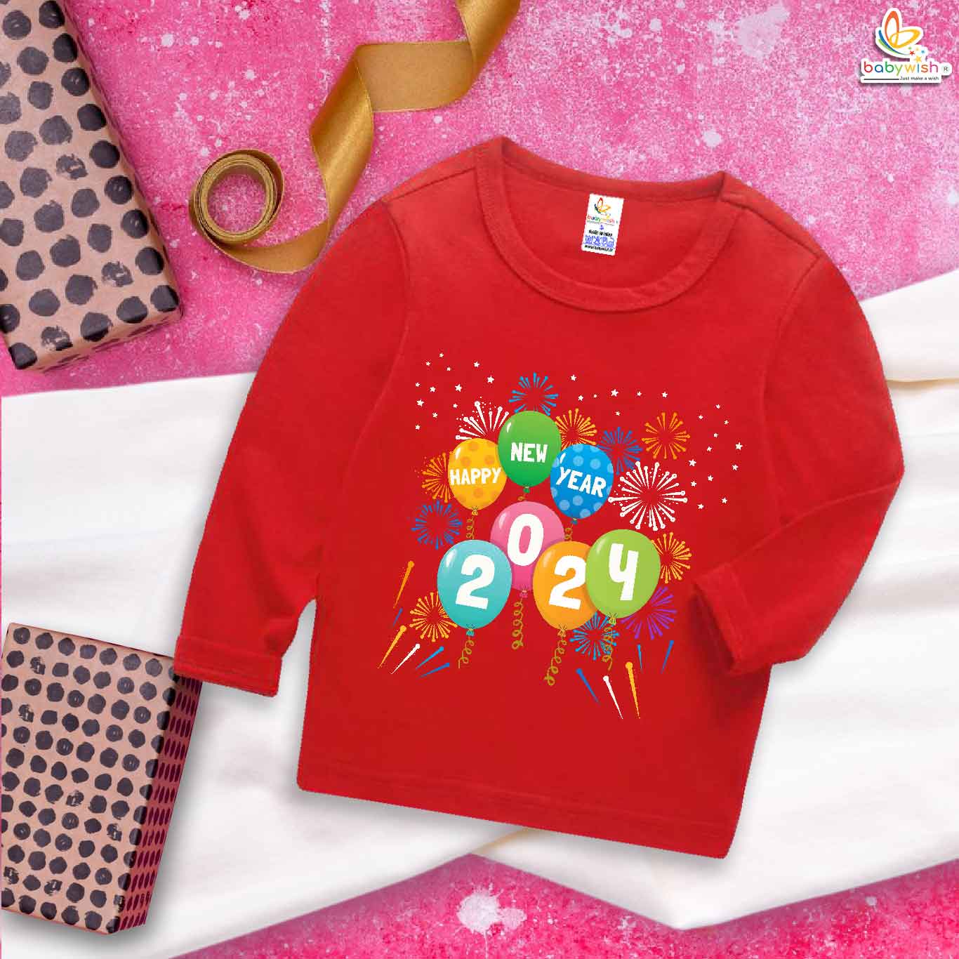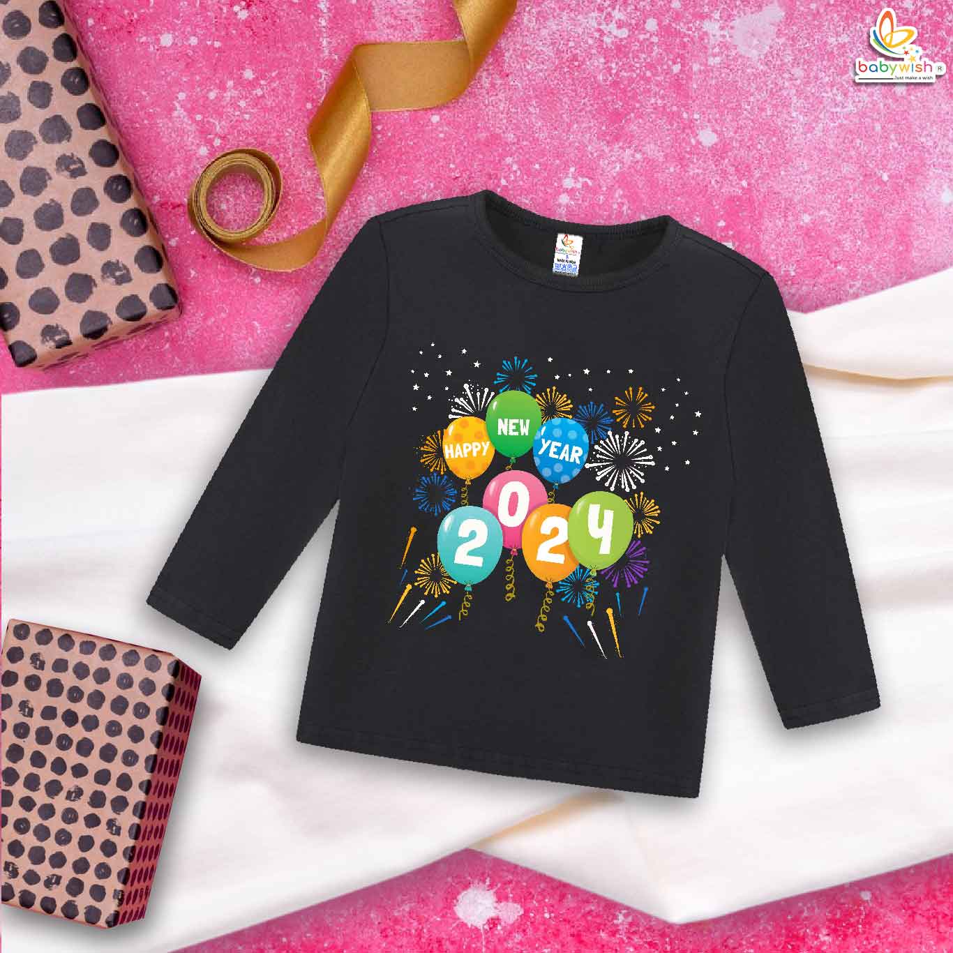 My First New Year T-Shirt | Happy New Year Firecrackers Balloon Print Full Sleeve Baby Tee | Holiday Outfit for Boys & Girls – Babywish