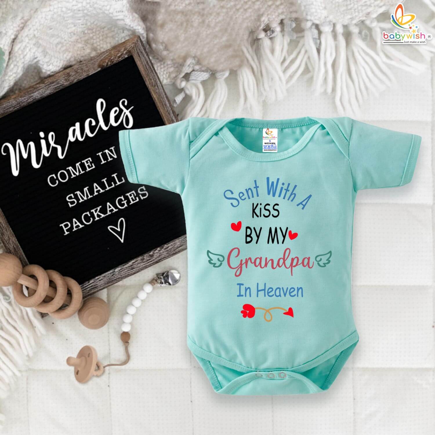 Celebrate your little miracle with this touching “Sent With A Kiss By My Grandpa In Heaven” baby bodysuit from Babywish. Crafted with love and care, this baby romper is made from 100% premium cotton for superior comfort and softness on your baby’s delicate skin.
