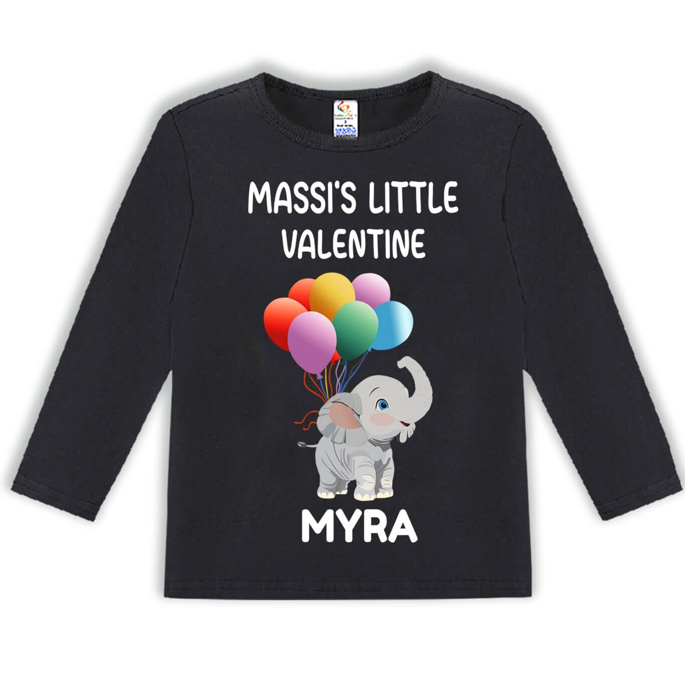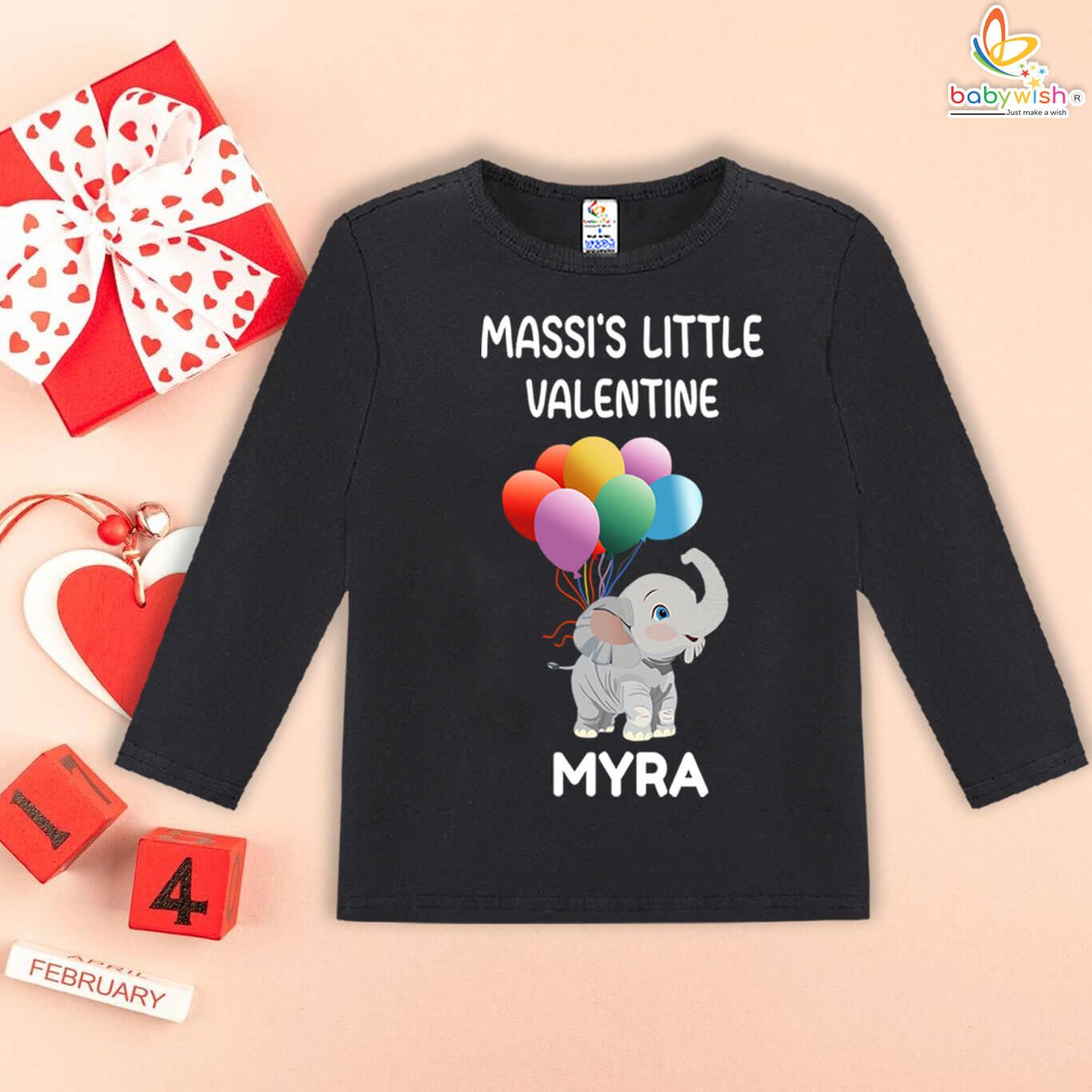 Celebrate love, family bonds, and precious baby moments with the Babywish “Massi’s Little Valentine” Personalized Baby T-Shirt. Specially designed for Valentine’s Day, this adorable outfit features a cute elephant holding colorful balloons along with the sweet message “Massi’s Little Valentine” and your baby’s name printed on it.