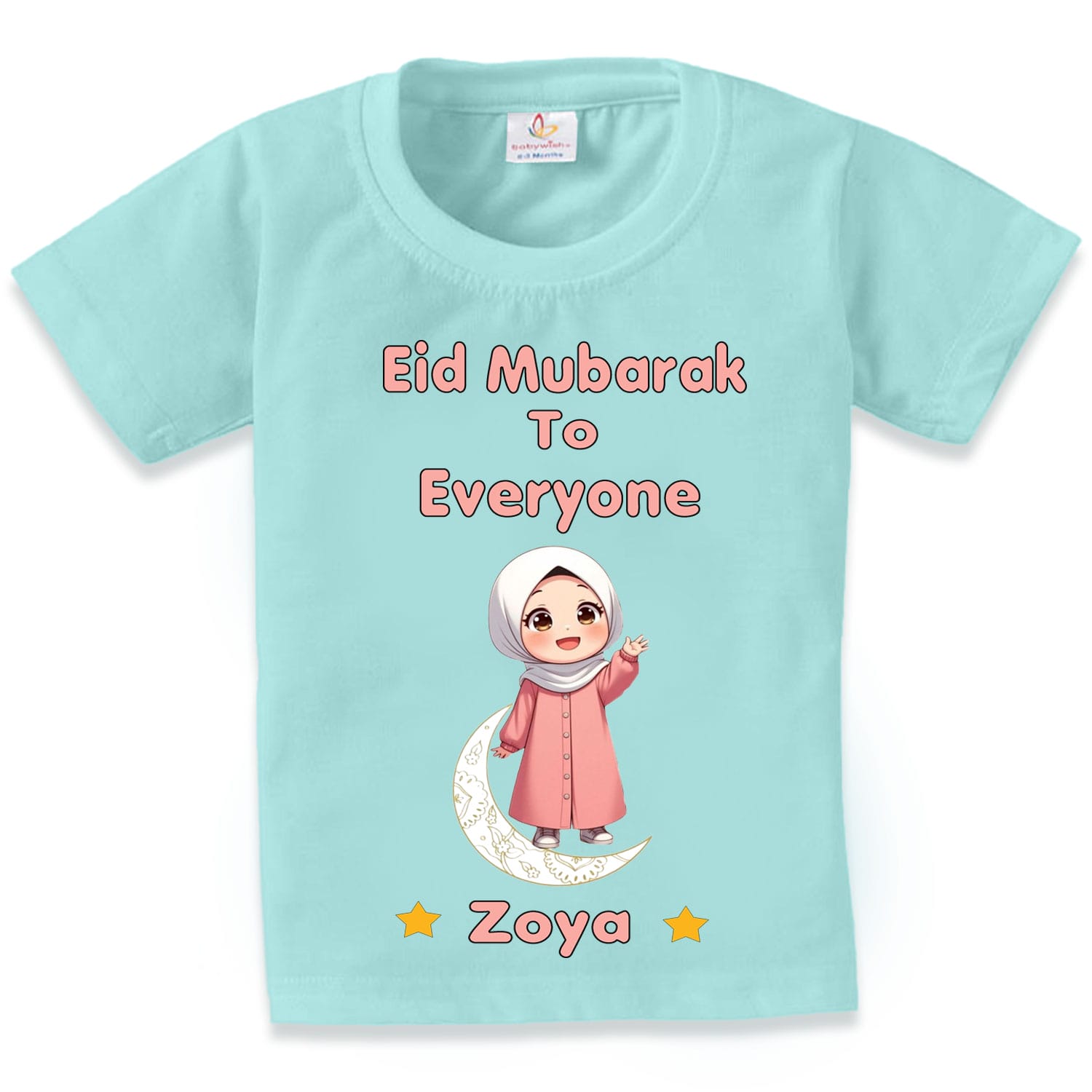 Make this Eid extra magical for your little princess with our Eid Mubarak To Everyone Zoya Custom Name Baby Girl T-Shirt. Designed with a beautiful cute hijab girl illustration sitting on a crescent moon, this festive T-shirt spreads happiness, blessings, and charm during Eid celebrations.
