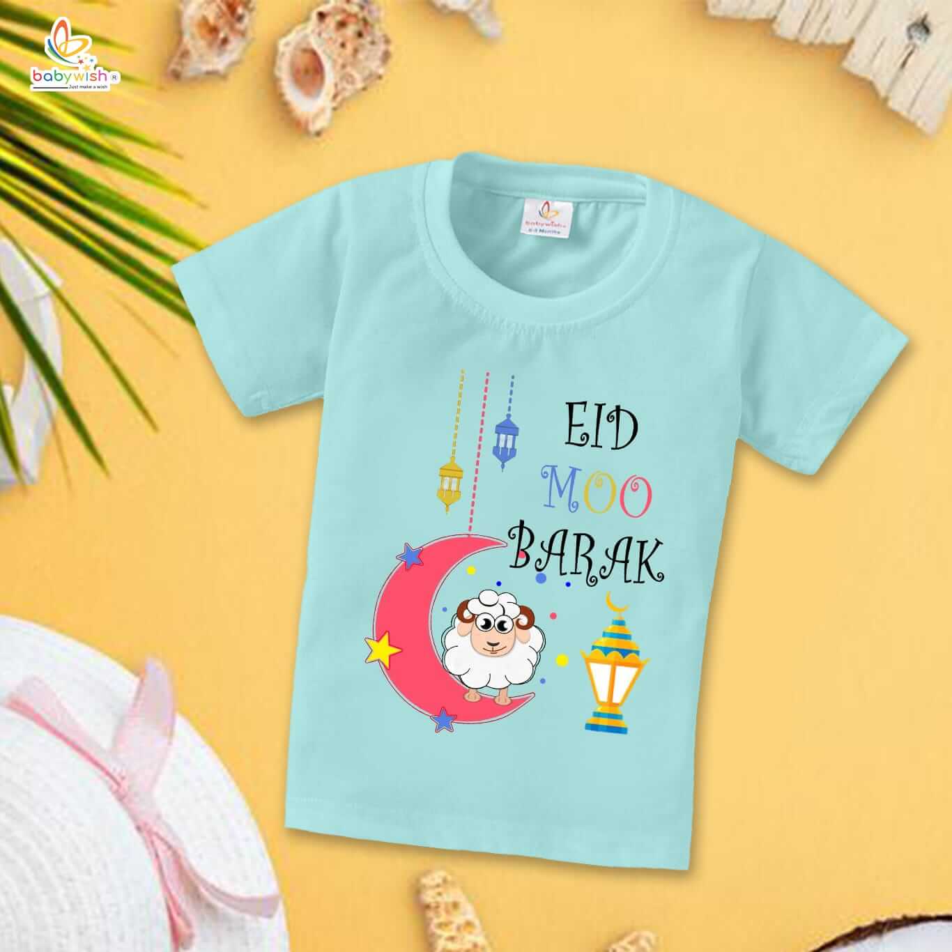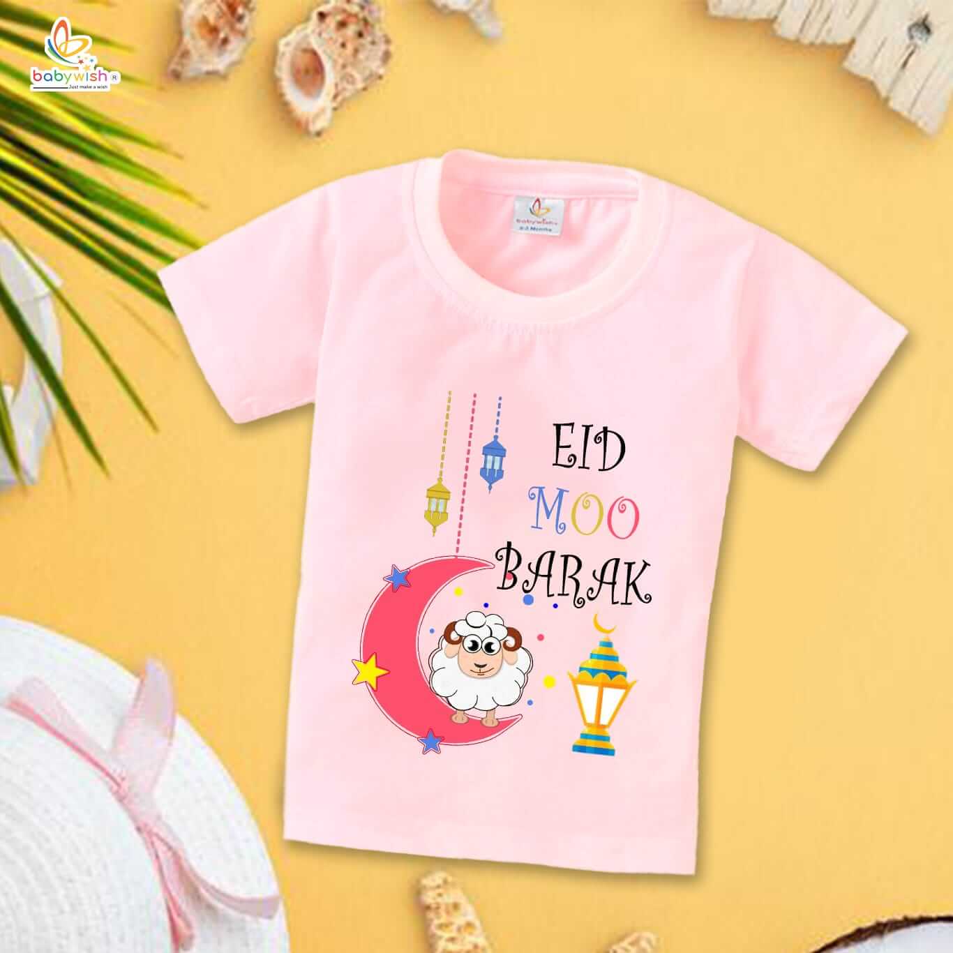 Eid T-shirt for Kids Unisex Ramadan Topwear Outfit | Printed Half Sleeve Tshirt Dress for Boys & Girls | Eid Moo Barak