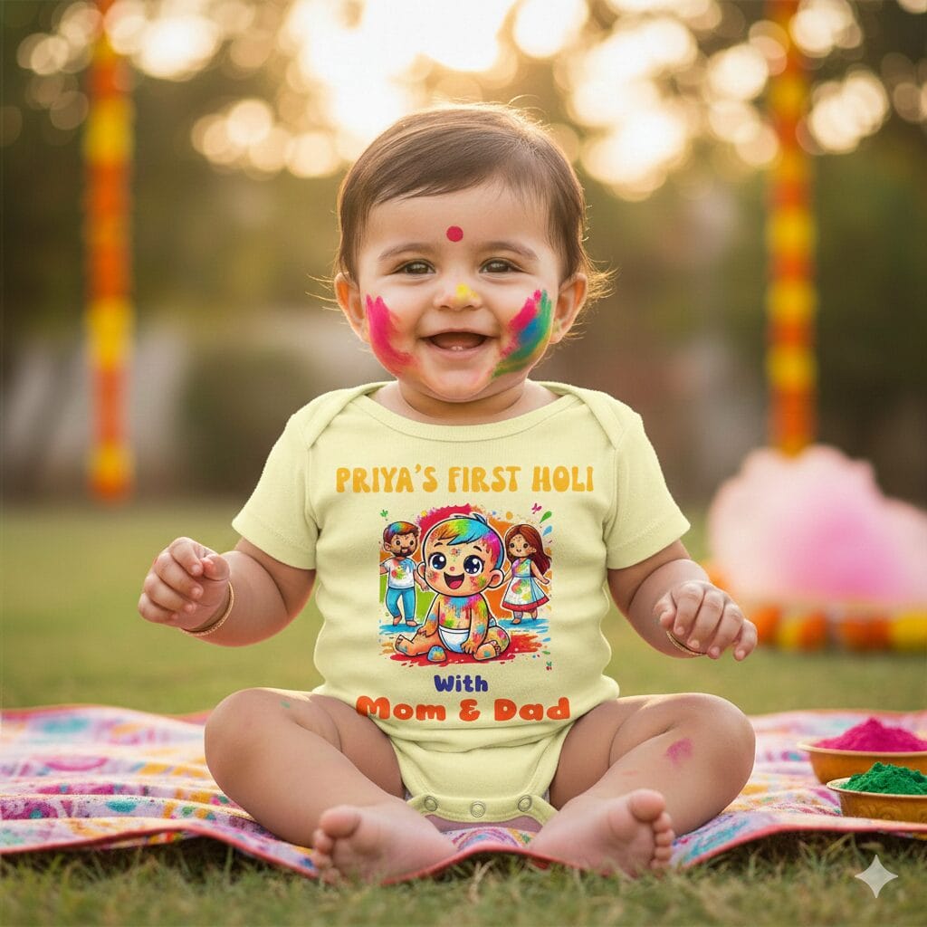 The bright “Wishing Happy Holi” print with colorful splashes creates a joyful festive vibe. The customized name option like “Vedant” adds a special personal touch, making it ideal for gifting and memorable Holi photos.