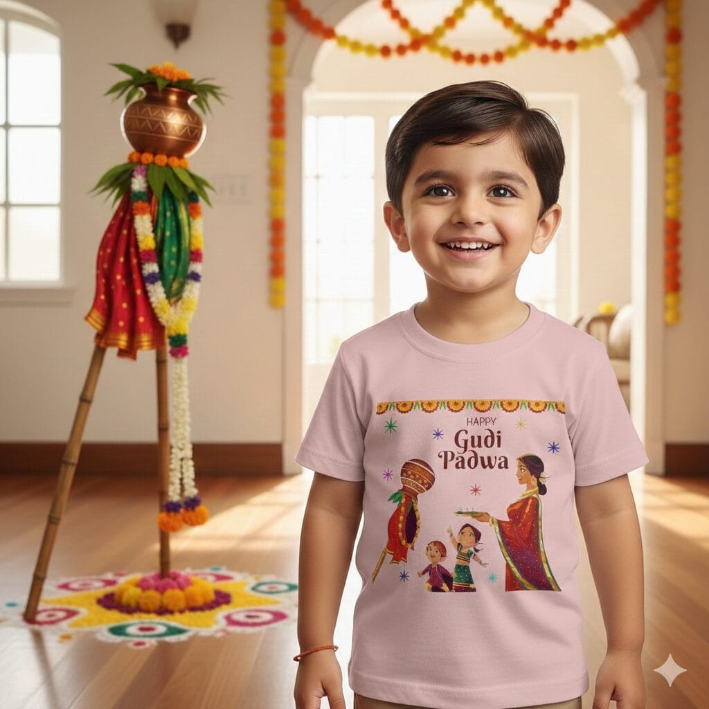 Gudi Padwa T-shirt for Kids – Unisex Topwear Outfit, Printed Half Sleeve Tshirt Dress for Boys and Girls “Happy Gudi Padwa” Perfect Festival Wear for Children