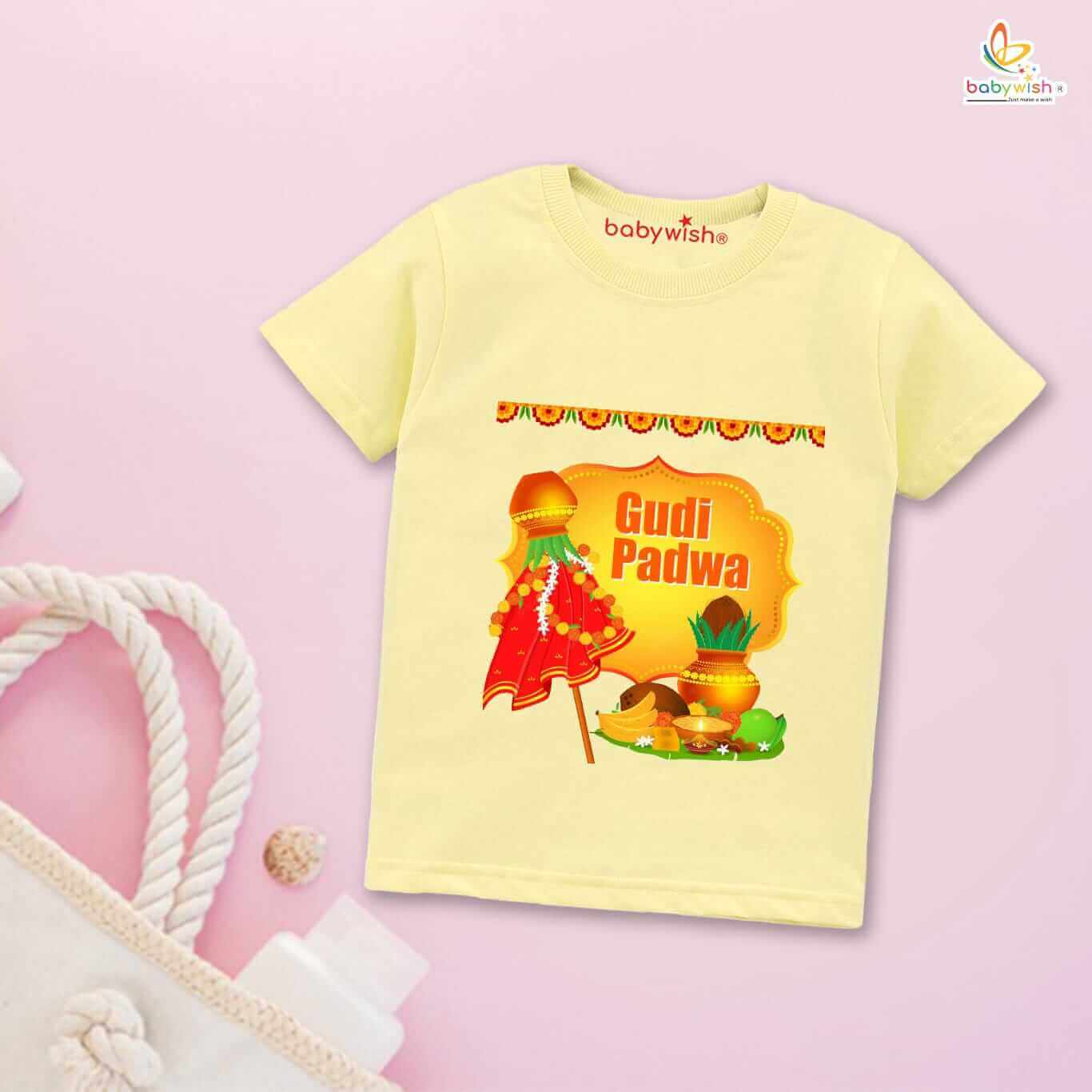 Gudi Padwa T-shirt for Kids – Unisex Topwear Outfit, Printed Half Sleeve Tshirt Dress for Boys and Girls “Worship on Gudi Padwa Festival” Perfect Festival Wear for Children