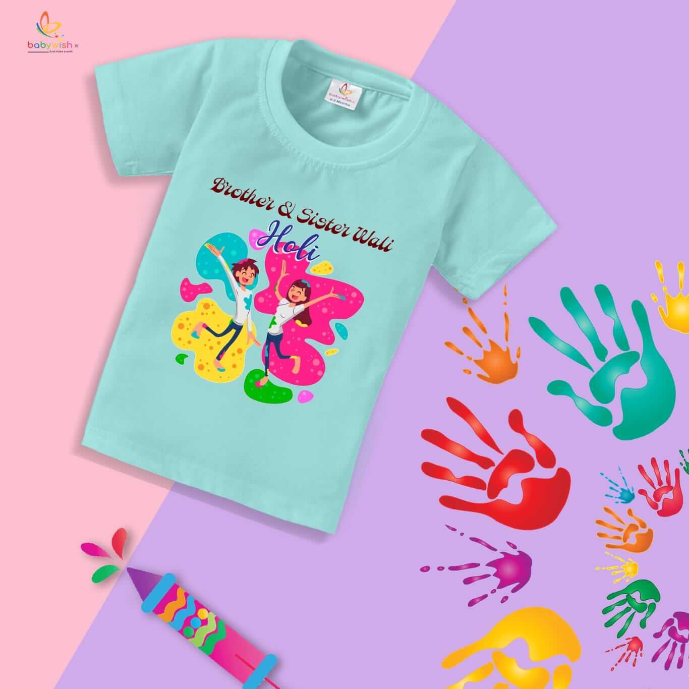 Holi T-shirt for Kids – Unisex Holi Topwear Outfit, Printed Half Sleeve Tee “Brother’s & Sister Wali Holi,” Fun Colorful Dress for Boys & Girls