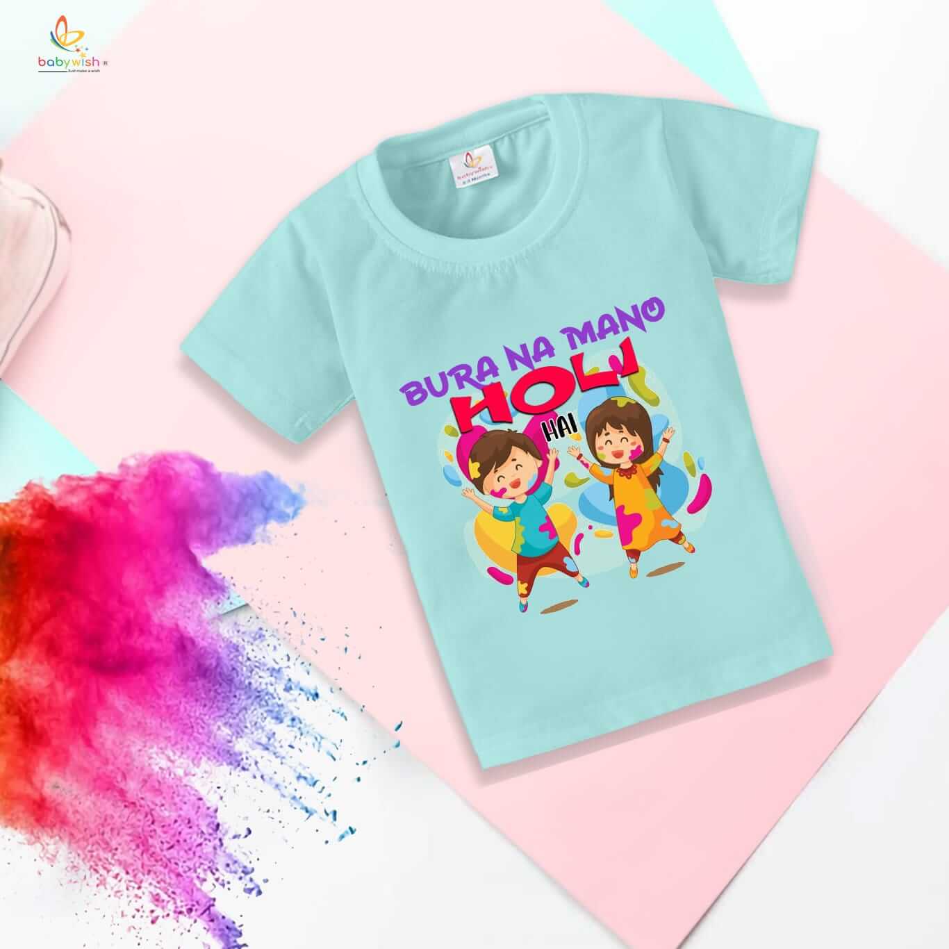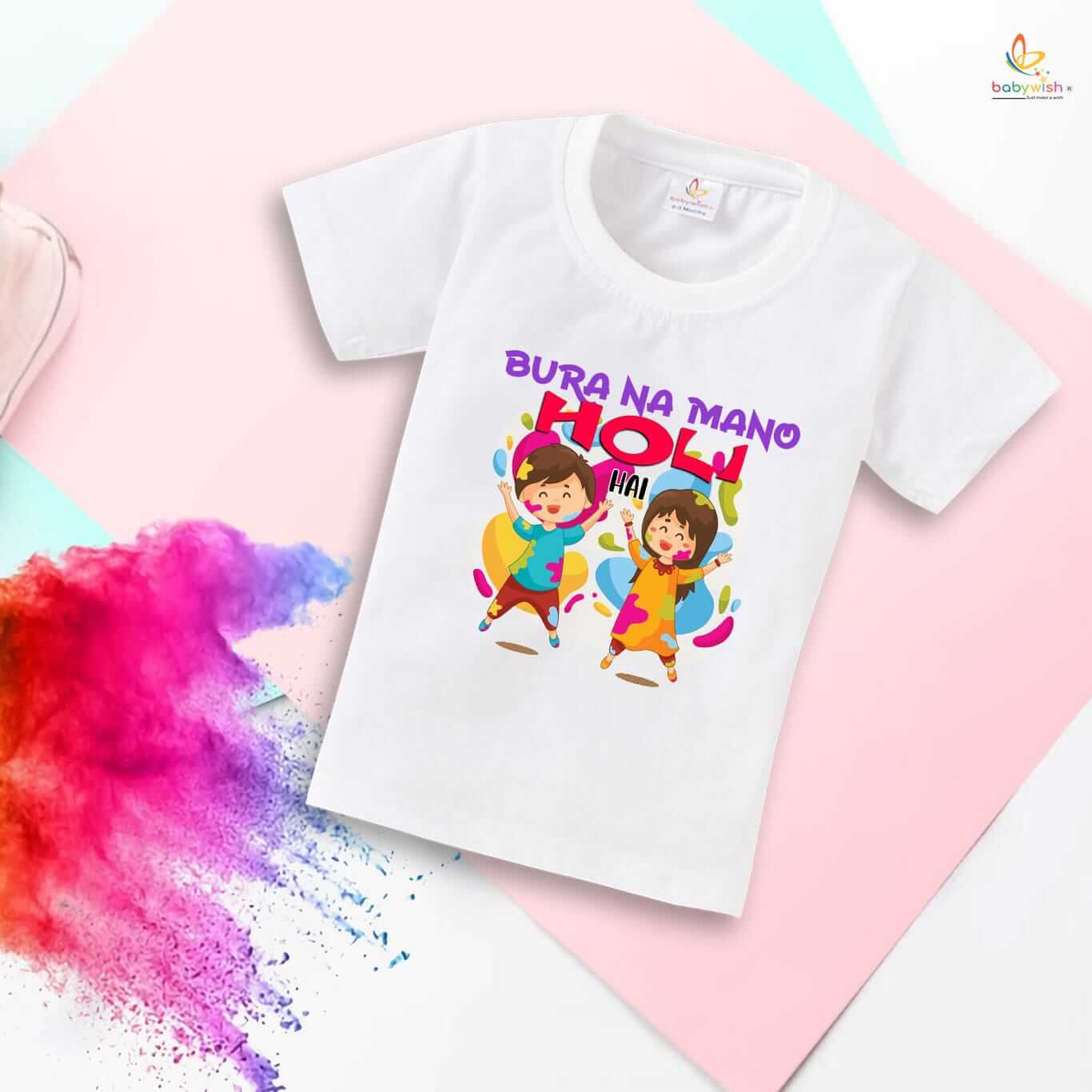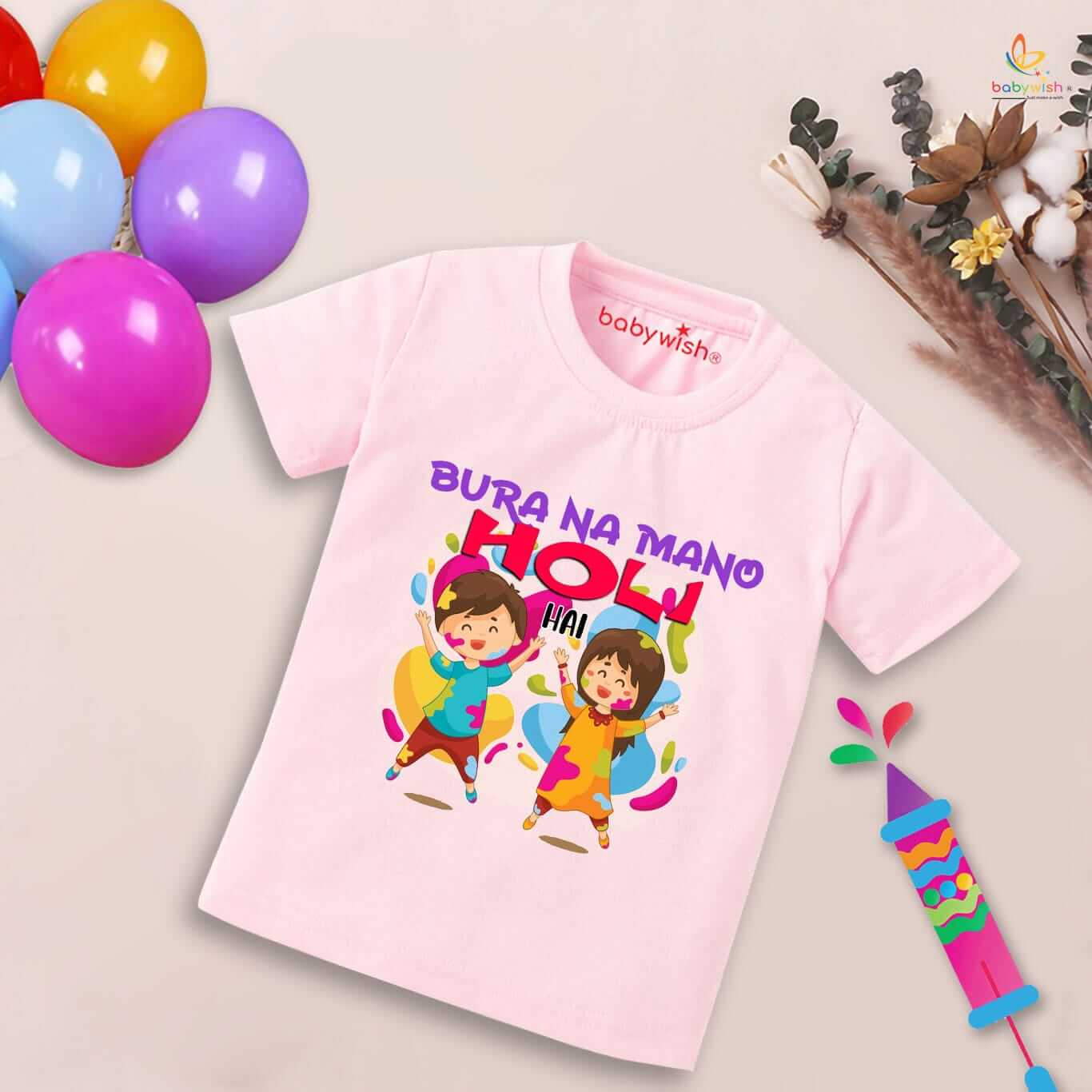 Holi T-shirt for Kids – Unisex Holi Topwear Outfit, Printed Half Sleeve Tee “Bura Na Mano It’s Festival,” Fun Colorful Dress for Boys & Girls