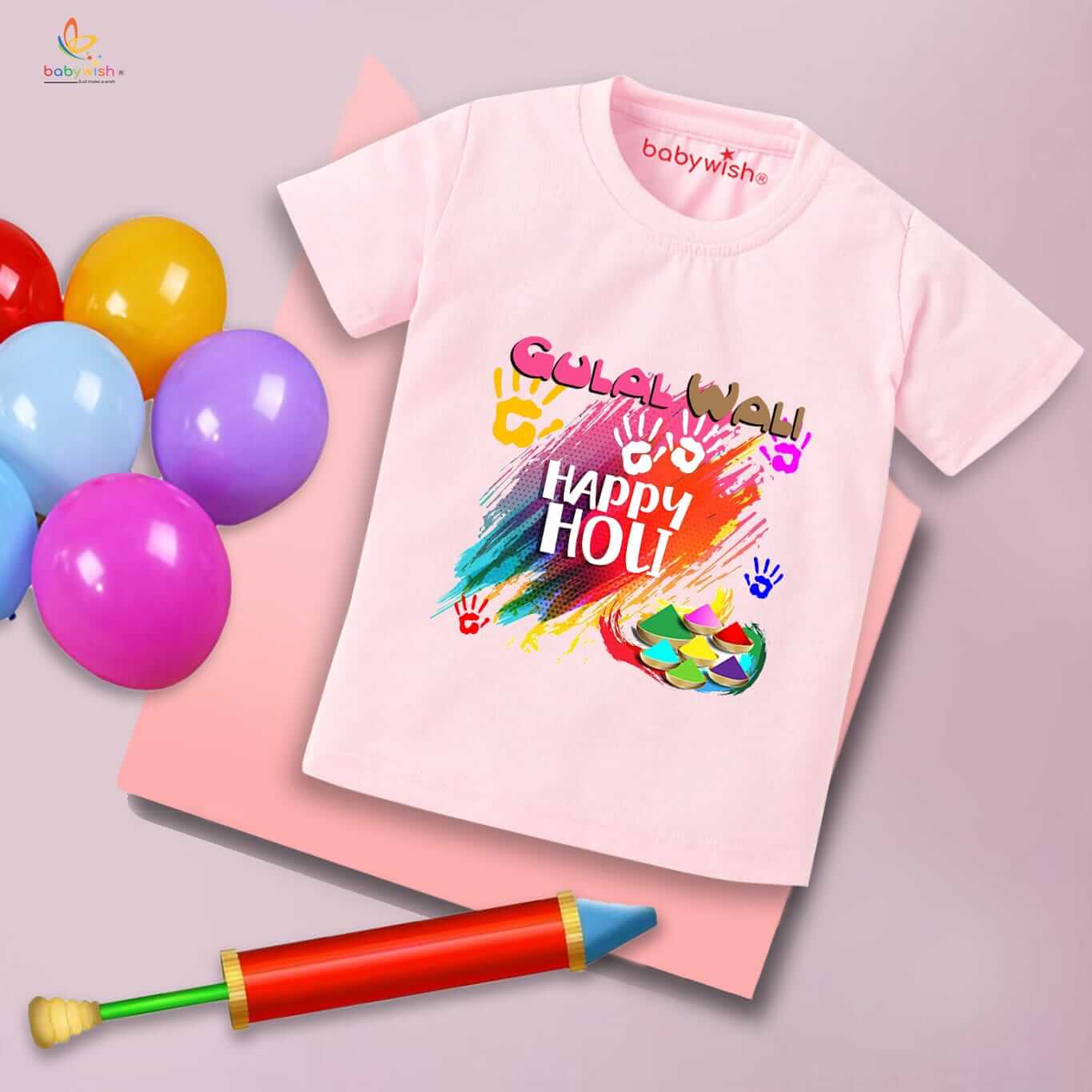 Holi T-shirt for Kids – Unisex Holi Topwear Outfit, Printed Half Sleeve Tee “Gulal Wali Happy Holi,” Colorful Festival Dress for Boys & Girls