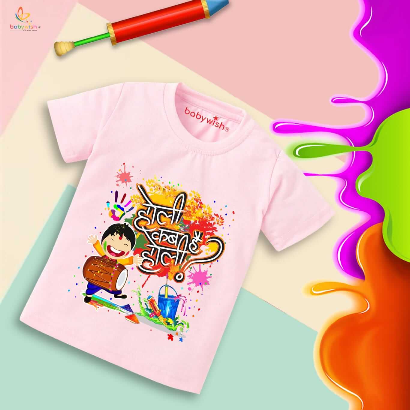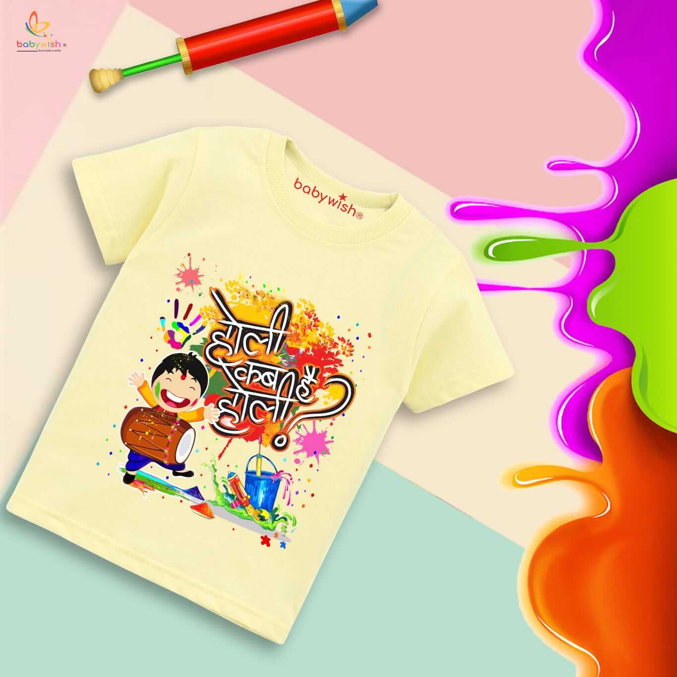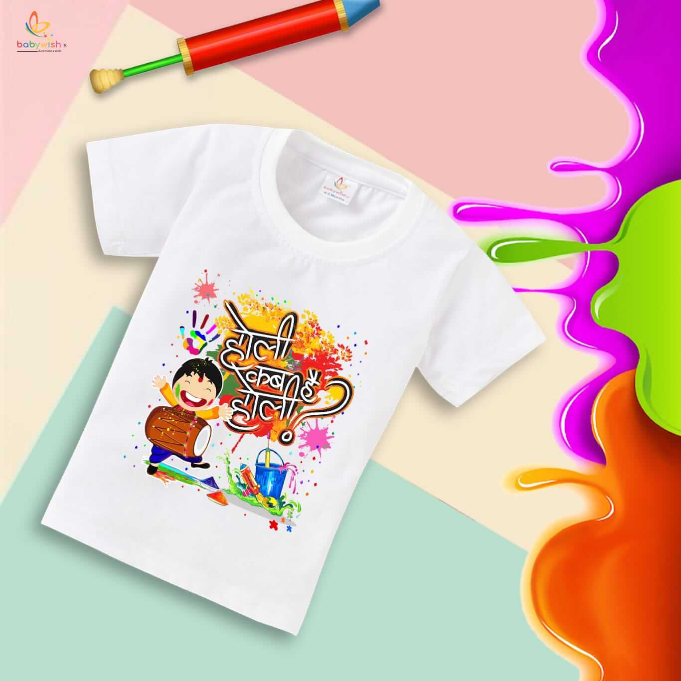 Holi T-shirt for Kids – Unisex Holi Topwear Outfit, Printed Half Sleeve Tee “Oye Gabbar Aaj Colorful Holi Hai,” Fun Colorful Festival Dress for Boys & Girls