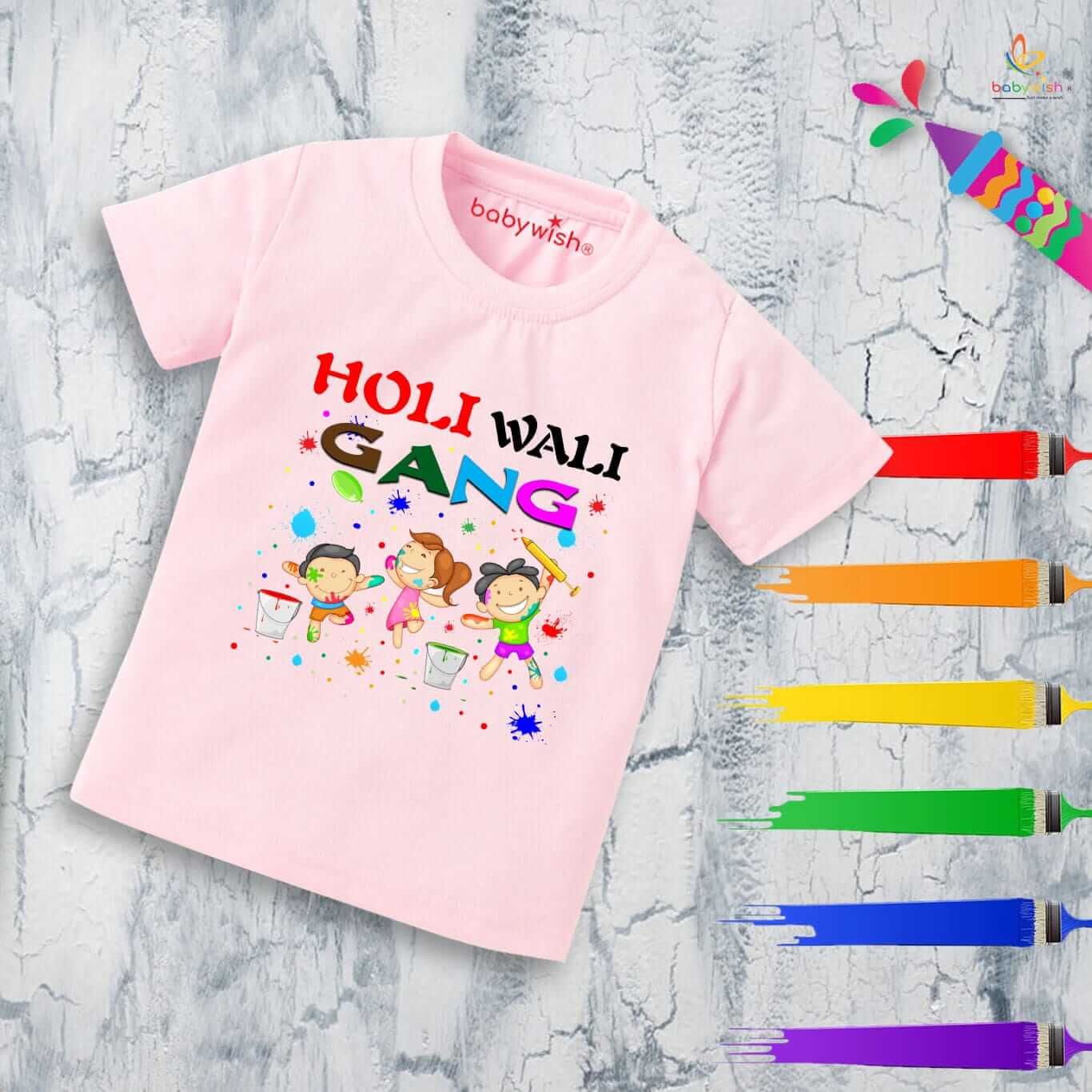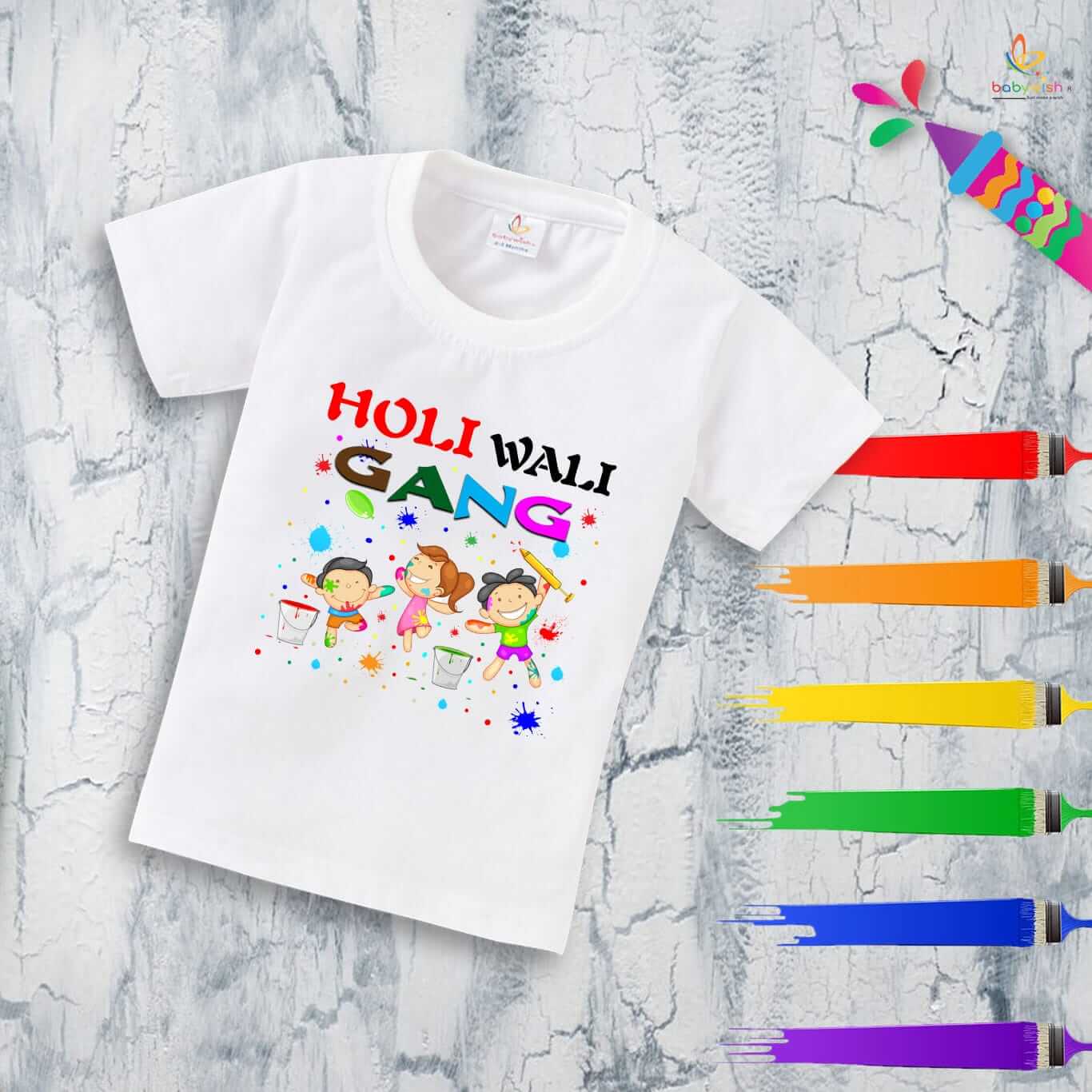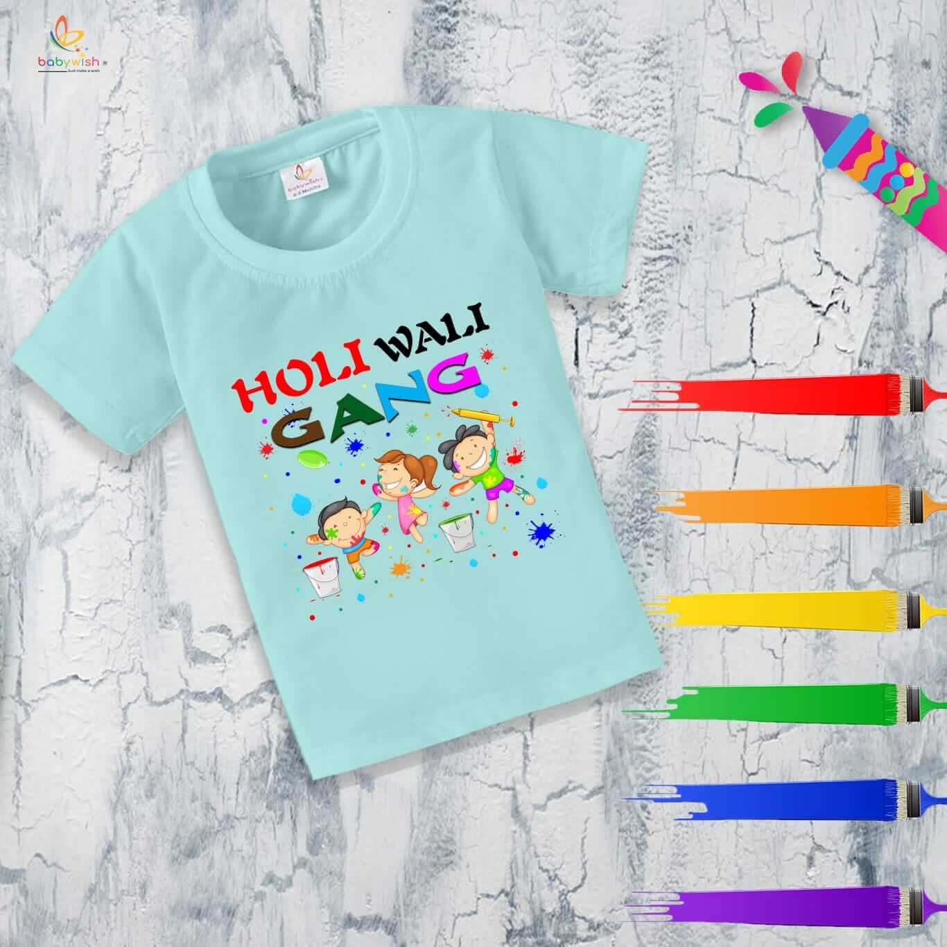 Holi T-shirt for Kids – Unisex Holi Topwear Outfit, Printed Half Sleeve Tee “Holi Wali Gang,” Colorful Festival Dress for Boys & Girls