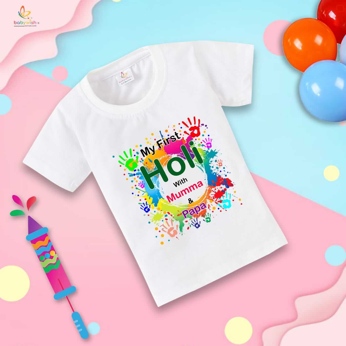 Holi T-shirt for Kids – Unisex Holi Topwear Outfit, Printed Half Sleeve Tee “Holi with Mumma,” Colorful Festival Dress for Boys & Girls