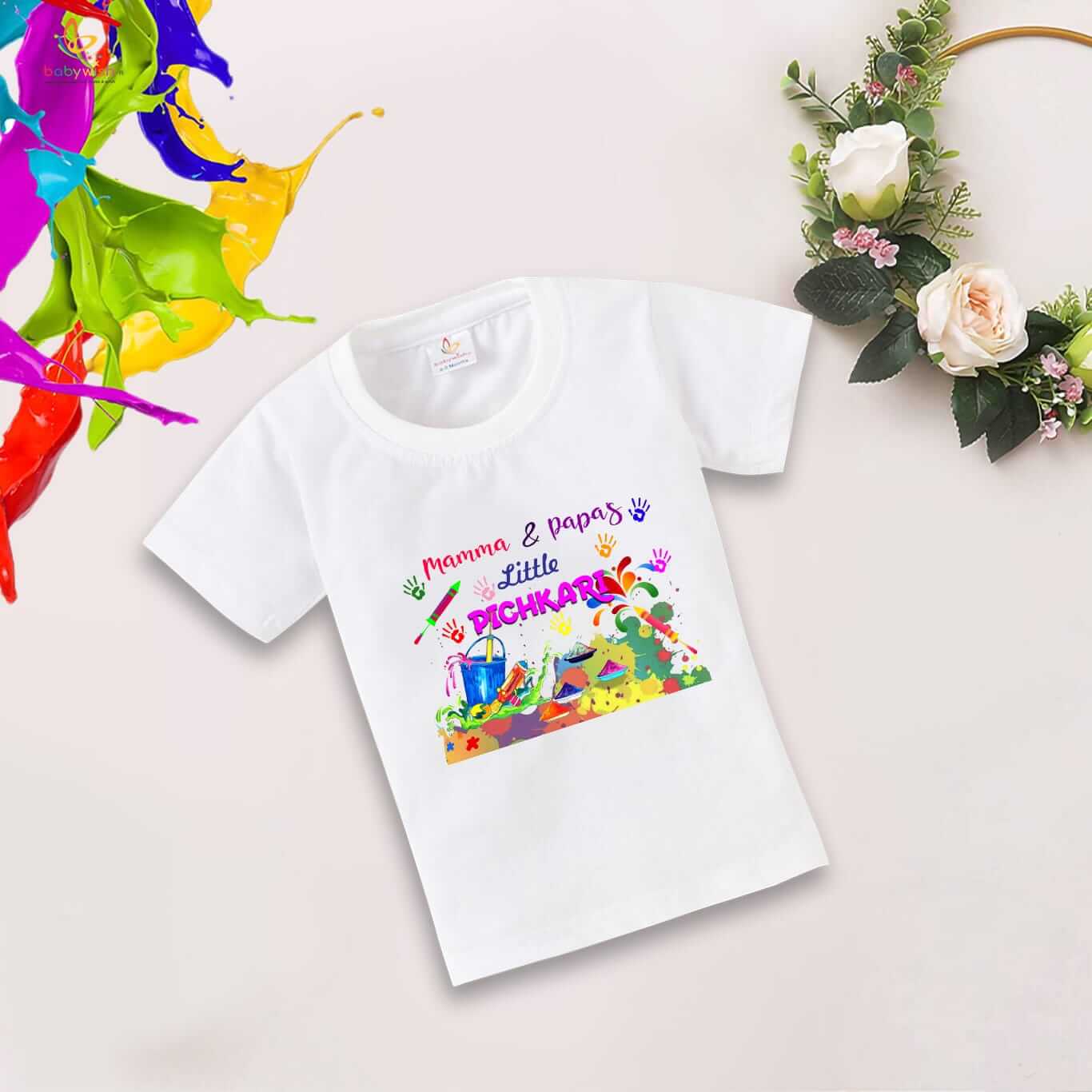 Holi T-shirt for Kids – Unisex Holi Topwear Outfit, Printed Half Sleeve Tee “Mammas & Papas Little Pichkari,” Colorful Festival Dress for Boys & Girls