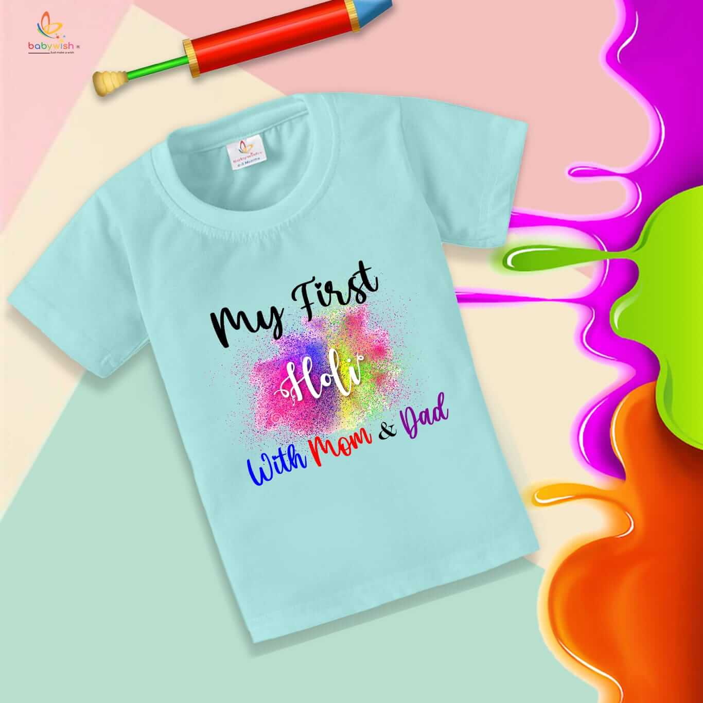 Holi T-shirt for Kids – Unisex Holi Topwear Outfit, Printed Half Sleeve Tee “My First Holi With Mom & Dad,” Colorful Festival Dress for Boys & Girls