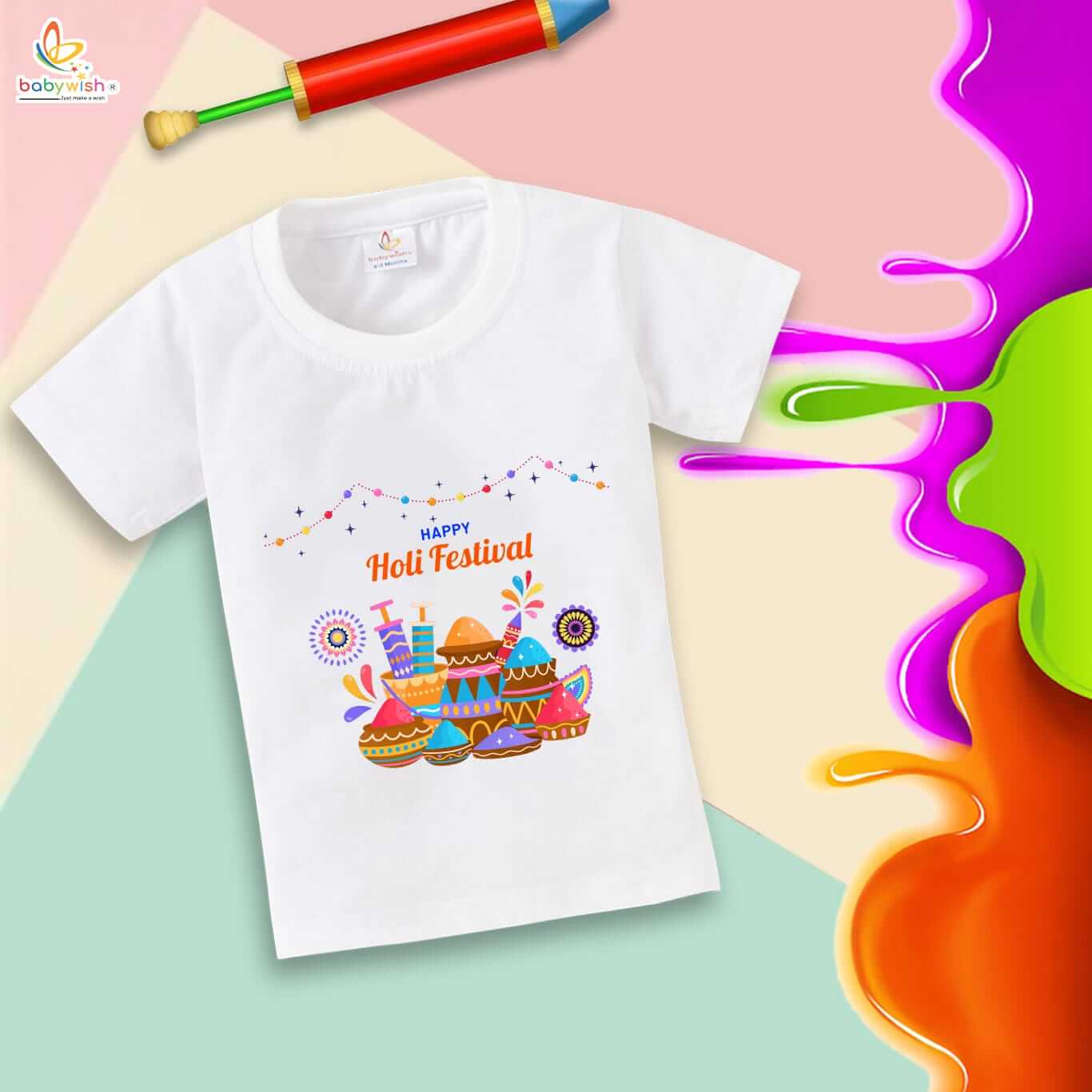Holi T-shirt for Kids | Unisex Holi Topwear Outfit | Printed Half Sleeve Tshirt Dress for Boys & Girls | “Happy Holi Festivals Watergun” Design