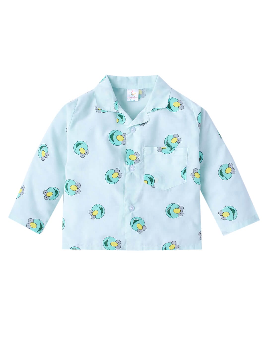 This blue Emoji cotton sleepsuit is ideal for kids aged 1 to 10 years. Designed with adorable prints and crafted from ultra-soft, breathable fabric, it ensures a peaceful sleep. The button-up shirt and matching pants provide all-night comfort and ease – Babywish.
