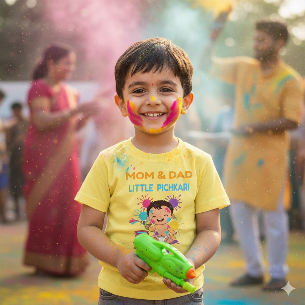 Make this Holi extra special for your little one with our Mom & Dad Little Pichkari Arav Baby Holi T-Shirt by Babywish. Designed with a cute festive baby cartoon holding a pichkari, this t-shirt captures the true joy of Holi celebrations.