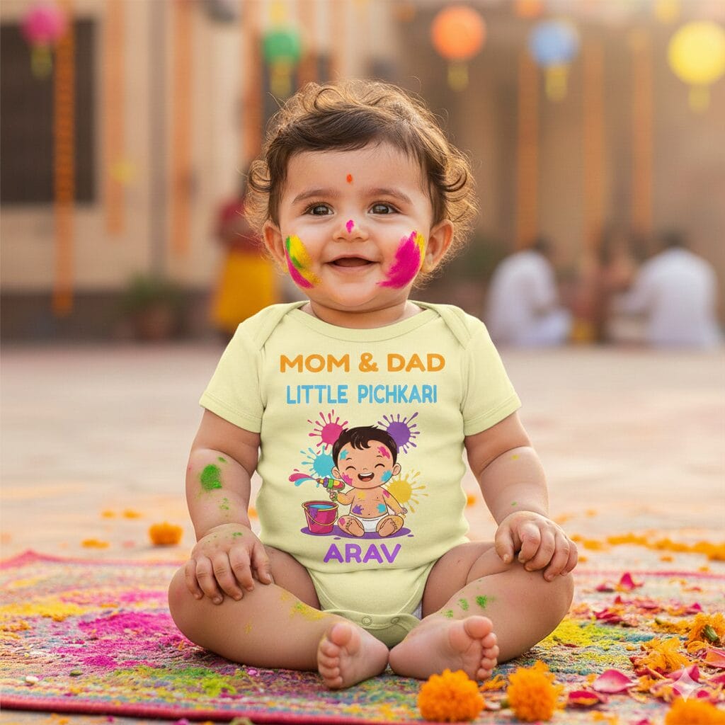 Celebrate your baby’s first Holi in the cutest way with our Mom & Dad Little Pichkari Arav Kids T-Shirt by Babywish. Designed specially for little champs, this adorable Holi festival T-shirt features a joyful baby with pichkari print and personalized name option, making it a perfect festive outfit.