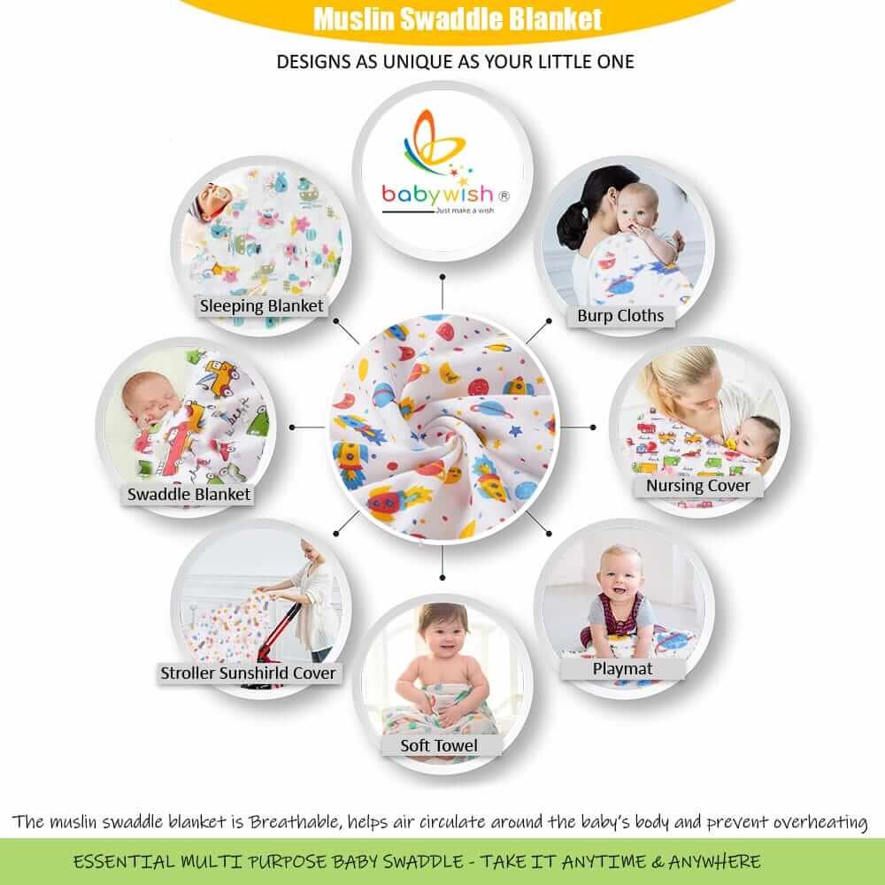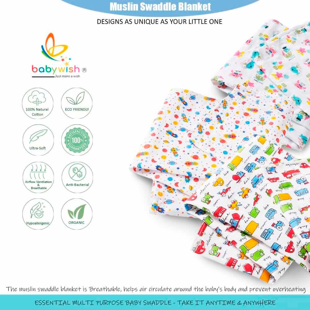 Babywish Organic muslin swaddle blankets 4 pack is made of super soft organic cotton for the softest touch on baby’s gentle skin for more peaceful sleeping. The open weave increases breathability and reduces the risk of overheating.