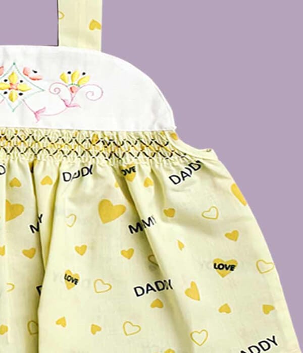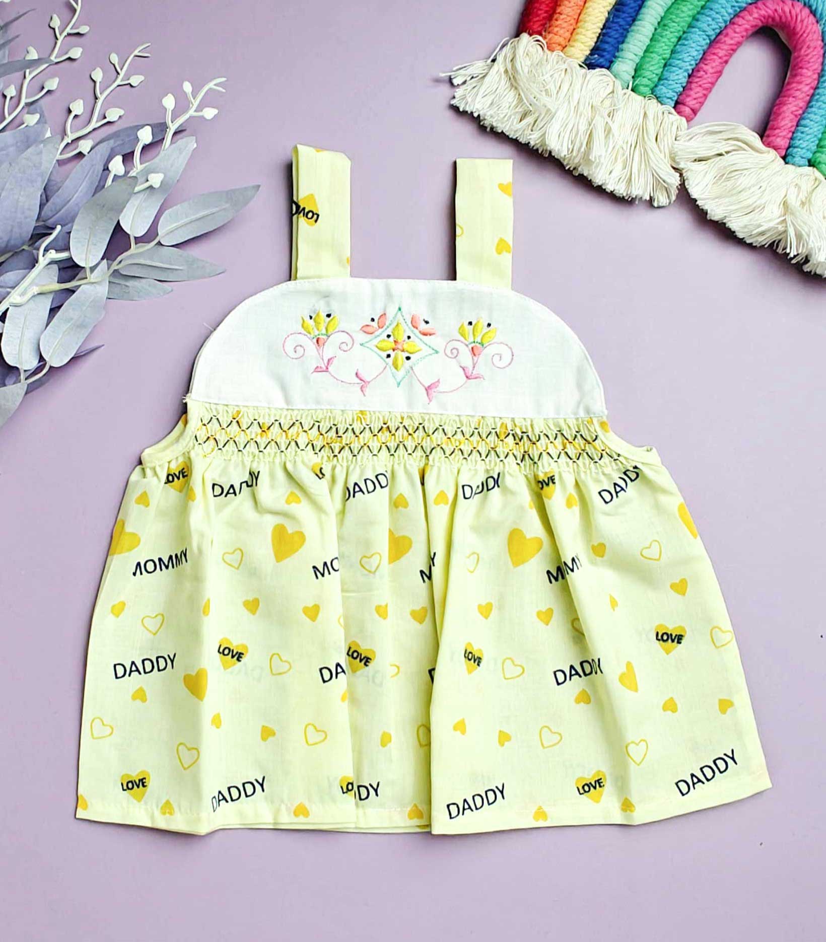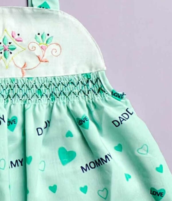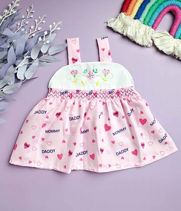 Dress your little one in this charming cotton frock designed for newborns up to 12 months. Featuring a sweet “Mommy Daddy” heart print and delicate embroidery, this soft, sleeveless dress ensures comfort for your baby’s sensitive skin. Lightweight and breathable, it’s perfect for summer days or casual outings. A must-have from Babywish!