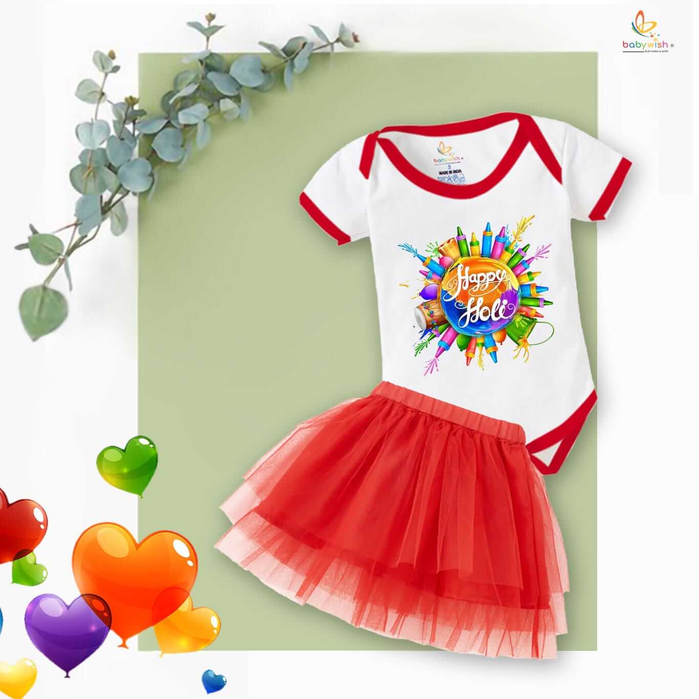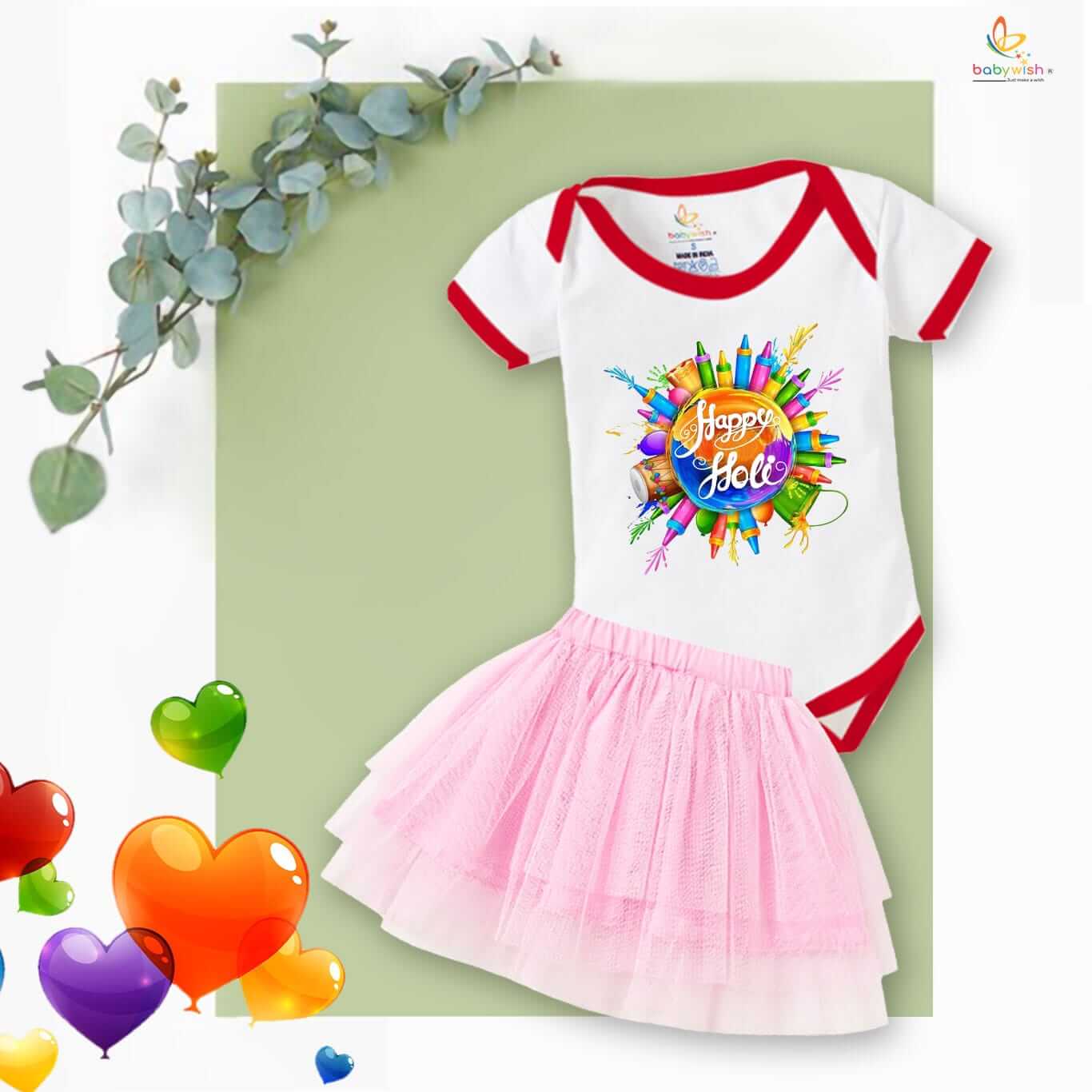Newborn Girl’s Tutu Skirt & Romper | Holi Print Onesies Bodysuits | Baby 0–3 Months | Soft, Comfortable, Breathable Outfit for Festivals & Everyday Wear